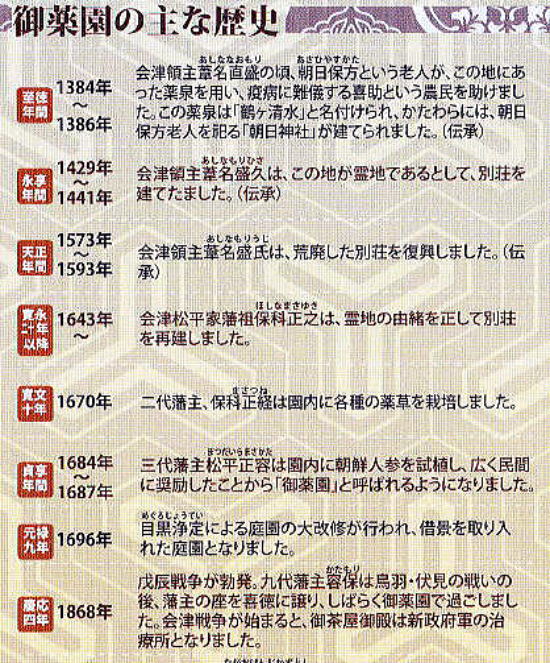 | <総合メニューへ> 久々の会津若松 御薬園 1 御薬園 2 日新館 はじめに 概要・歴史 学習・自習 大学・資料室 武術・天文台 仏都会津の三霊地巡り 中田観音 立木千手観音 鳥追観音 2018年6月17日~19日、青山貞一、池田こみちは、2011年3月11日以降の東日本大震災、津波、福島第一原発事故による影響、被害の復旧・復興状況を調査するため福島県内の調査を実施した。 調査が一段落した6月19日、私たちは今まで訪問していない会津若松の歴史文化の拠点を訪問することにした。 6月19日午前、最初に訪問したのは、宿泊先旅館からほど近いところにある。この日は超がつく好天。会津は盆地で暑すぎるくらいだ。 御薬園、〒965-0804 福島県会津若松市花春町8?1 ![]() 出典:グーグルマップ ![]() 出典:グーグルマップ ![]() 出典:御薬園 入園時にいただくパンフの表紙 下の地図は、パンフにある園内の案内図である。正門は地図中、左上にある。 ![]() 出典:御薬園 入園時にいただいたパンフにある案内図 御薬園(おやくえん)は、福島県会津若松市にある日本庭園で会津松平氏庭園として国の名勝に指定されている。下はその御薬園の入り口である。 ![]() 撮影:青山貞一 Nikon Coolpix S9900 ![]() 出典:Wikimedia Commons ![]() 撮影:池田こみち Nikon Coolpix S9900 ![]() 出典:御薬園 入園時にいただいたパンフにある重陽閣 下は秩父宮妃勢世子氏のレリーフ。 ![]() 撮影:青山貞一 Nikon Coolpix S9900 歴史 御薬園の起こりは、室町時代に霊泉の湧きだしたこの地に、永享4年(1432年)、蘆名盛久が別荘を建てたのがはじまりといわれている。 その後の江戸時代の寛文10年(1670年)、会津藩2代藩主保科正経が領民を疫病から救うために園内に薬草園を作り、3代藩主松平正容が貞享年間に朝鮮人参を試植し、その栽培を民間に広く奨励したことから、それが名前の由来となっている。 現在の庭園は、元禄9年(1696年)、松平正容が園匠の目黒浄定を招き、小堀遠州の流れをくんだ本格的な大名型山水庭園に大改造したもの。園内の楽寿亭や御茶屋御殿の建物は、戊辰戦争時に新政府軍の傷病者の診療所とされたため、戦火を免れた。 昭和7年(1932年)10月19日に、江戸時代の代表的な大名型山水庭園として優秀なものとして国の名勝に指定された。昭和54年(1979年)6月25日には旧薬園跡、池水取入口などが追加指定された。 以下はパンフにみる御薬園の主な歴史。 ![]() 出典:御薬園 入園時にいただいたパンフにあった主な歴史 ![]() 撮影:青山貞一 Nikon Coolpix S9900 概要 御薬園の敷地面積は約1.7ha。中央に心字の池を配し、その中央に亀島と楽寿亭を置き、池辺には巧みに石を配し、池への流水路として女滝、男滝を置く。 ![]() 撮影:青山貞一 Nikon Coolpix S9900 ![]() 撮影:池田こみち Nikon Coolpix S9900 下は庭園の解説。 ![]() 撮影:青山貞一 Nikon Coolpix S9900 園内に多くのモミ、スギ、マツの大樹老木を配置し、キャラボク、ゴヨウマツの古木を点植し、回遊園路を設けた、東側の背炙山の連山を背景とした借景池泉回遊式庭園である。 心字の池西側には御茶屋御殿があり、茶会などに利用されている。庭園北側には藩政時代の薬草栽培地跡を利用した薬用植物標本園があり、会津産薬草約200種を含め約400種の薬草が栽培されている。 下は心字の池の中央にある楽寿亭。 ![]() 心字の池の中央にある楽寿亭 撮影:青山貞一 Nikon Coolpix S9900 ![]() 撮影:青山貞一 Nikon Coolpix S9900 つづく |