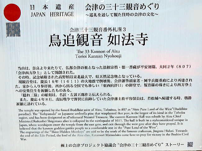 下の写真は新潟県側を写したもの。遠くに雪をかぶった連山が見える。 ![]() 撮影:青山貞一 Nikon Coolpix S9900 そうこうするうちに鳥追観音の到着した。下は3観音共通のデザインの観音告知板である。やはり新潟に近い福島県最西端にある鳥追観音には格別なものを感じる。 ![]() 撮影:青山貞一 Nikon Coolpix S9900 以下は山門。 ![]() 撮影:青山貞一 Nikon Coolpix S9900 下は池田がやっとのことで撮影した山門の阿吽の仁王像。 ![]() 撮影:池田こみち Nikon Coolpix S9900 撮影:池田こみち Nikon Coolpix S9900 山門には大きなわらじがかかっていた。 ![]() 撮影:青山貞一 Nikon Coolpix S9900 鳥追観音如法寺の概要 鳥追観音如法寺は、仏都会津の祖・徳一大師が、千二百年前の平安初期大同2年(807)に、会津の西方浄土として御開創なされた屈指の観音霊場であります。 御本尊鳥追聖観音は、僧行基御作と伝え、衆生を導いてこの世の寿命を全うさせ、あの世は西方浄土の阿弥陀仏の世界へ安楽往生させるという御誓願と、子授け・安産・子育て・厄除け・健康・長寿の広大無辺なご利益から、老若男女の厚い信仰を集めております。 また、会津ころり三観音の一、会津三十三観音番外別格の結願所として、二世(この世・あの世)の安楽を願い、≪命のふるさと・鳥追観音≫へ参る巡礼者が絶えません。 さらに、当地西会津は、霊峰飯豊山の南麓に位置し、阿賀川が悠然と流れる山紫水明の里であり、如法寺境内には、樹齢千二百年の高野槙が孤高に聳え立ち、春は桜と若葉、夏は深緑、秋は紅葉、冬は雪景色と四季折々の趣きもまた格別で、まさに≪仏都会津の西方浄土・鳥追観音如法寺≫は、身も心も癒される≪命のふるさと≫と申せます。 下は鳥追観音如法寺の境内に掲げられていた縁起である。 ![]() 撮影:青山貞一 Nikon Coolpix S9900 下の写真は鳥追観音如法寺の本堂を撮影したものである。 ![]() 撮影:青山貞一 Nikon Coolpix S9900 以下は日本遺産による鳥追観音如法寺の告知案内である。 ![]() 撮影:青山貞一 Nikon Coolpix S9900 以下は本堂内部。 ![]() 撮影:青山貞一 Nikon Coolpix S9900 下はご本尊。 ![]() 撮影:池田こみち Nikon Coolpix S9900 本堂の一角に下の写真のような仏像が多数鎮座していた。 ![]() 撮影:青山貞一 Nikon Coolpix S9900 ![]() 撮影:青山貞一 Nikon Coolpix S9900 この時期、境内にはさまざまな花が咲き誇っていた。この白い花はシャクヤク(芍薬)。花は大輪で美しく、観賞用、茶花としても好まれ、また、薬草としても貴重なものである。 ![]() 撮影:青山貞一 Nikon Coolpix S9900 境内には樹齢が相当ある高野槙の木があった。樹齢はなんと、1200年である。 ![]() 撮影:青山貞一 Nikon Coolpix S9900 ※ コウヤマキ(高野槙、高野槇、学名:Sciadopitys verticillata)は、マツ目コウヤマキ科の日本および韓国済州島の固有種。常緑針葉樹で高木となる。別名ホンマキ。コウヤマキ科は1属1種であり、コウヤマキのみを含む。 下は樹齢1200年余の高野槙の木である。 ![]() 撮影:池田こみち Nikon Coolpix S9900 ◆左甚五郎の彫刻 「災難より隠れ猿」,「災難より逃れ猿」,「安楽に暮らし猿」 ![]() 撮影:青山貞一 Nikon Coolpix S9900 鳥追観音如法寺には、貴重な彫刻がある。 日光東照宮の作品でも有名な左甚五郎が心を込めて刻んだと伝えられる、三匹の猿の彫刻がある。それぞれ「災難より隠れ猿」,「災難より逃れ猿」,「安楽に暮らし猿」のいわれがあり、三匹目の猿は、牡丹の蕾に似せて隠し彫りされている。観音の大慈大悲に祈願してこの三猿を探し得れば、固いつぼみが花開くように幸運が開き「福マサル」といわれている。 ※ 左 甚五郎(ひだり じんごろう、ひだの じんごろう) 江戸時代初期に活躍したとされる伝説的な彫刻職人。落語や講談、松竹新喜劇で有名であり、左甚五郎作と伝えられる作品も各地にある。講談では地元の大工に腕の良さを妬まれて右腕を切り落とされたため、また、左利きであったために左という姓を名乗ったという説もある。日光東照宮の眠り猫をはじめ、甚五郎作といわれる彫り物は全国各地に100ヶ所近くある。しかし、その製作年間は安土桃山時代 - 江戸時代後期まで300年にも及び、出身地もさまざまであるので、左甚五郎とは、一人ではなく各地で腕をふるった工匠たちの代名詞としても使われたようである。 ![]() 撮影:青山貞一 Nikon Coolpix S9900 ![]() 撮影:青山貞一 Nikon Coolpix S9900 これは池田が撮影した甚五郎の猿の彫刻! ![]() 撮影:池田こみち Nikon Coolpix S9900 ↓ここ ![]() 撮影:池田こみち Nikon Coolpix S9900 私たちは鳥追観音参拝後、昼食をいただくために西会津の道の駅に向かった。下の写真は道の駅である。ここも2011年12月に来た時とだいぶ変わっていた。 ![]() 撮影:青山貞一 Nikon Coolpix S9900 食事後、当初予定通り、西会津→磐越自動車道→東北自動車道→首都高速と乗り継ぎ無事、夕方に東京にもどった。時間は4時間弱である。 ![]() 出典:グーグルマップ 宮城県編 調査の内容と方法へつづく <総合メニューへ> |