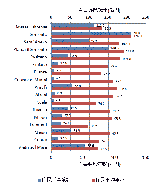 ●住民平均所得と住民総所得 表2および図11は、アマルフィ海岸自治体住民の一人当たりの個人所得(年収)およびの住民の総所得(年収)を示している。 表3からも明らかなように、イタリアは先進国の中ではポルトガル同様、個人所得が非常に低い。個人の平均年収では、首都のローマでさえ額面で228万円、手取りで168万円となっている。 ちなみに表3の世界各国の個人平均年収の表を見ると、日本は額面で378万円、手取りで288万円であるから、イタリアはローマであっても日本の半分ちょっとである。先進国で最も高いのはデンマークで額面で月額47万円である。 今回の調査対象は、南イタリア地区だが、南イタリアはイタリアのなかでは個人所得が低い地域となっており、表2および図11を見ると、年収レベルの額面で70万円~120万円であることがわかる。上記は単純な個人平均所得なので、世帯単位とすると、それに約3倍することになるが、アマルフィ海岸自治体はそれでも世帯年収は 240万円~360万円である。 ![]() 図11 アマルフィ海岸自治体住民の個人平均所得 出典 http://www.comuni-italiani.it/065/index.html 出典 http://www.comuni-italiani.it/063/index.html 出典:青山貞一・池田こみち、南イタリア・アマルフィ海岸自治体の基礎調査データ① 表3 世界主要都市における平均月収 単位(円)