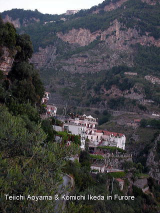 2013年アマルフィ海岸現地視察調査報告<125本 全体メニュー> アマルフィ海岸の位置 フローレの紋章 イタリア国旗 <4>日程・訪問先別ハイライト(2013年6月6日 その5 フローレのレストラン) 最初に、訪問先別の秀逸で希有な景観を写真でブログ風にご紹介しましょう。ソレント半島及びアマルフィ海岸の景観は、単なる自然の美ではありません。9世紀以来、持続する歴史や文化に彩られた空、海、地形によって醸成された希有で秀逸そして洗練された美があります。しかも、そこには慎ましやかな住民の生活と小規模自治体の競争的分権の連携があります。 ◆フレーレのB&Bと断崖絶壁上のレストラン 2013年6月6日 この日の宿泊はフローレ(Furore)です。 ところで、私達は、夕暮れ近くプライアーノを通過し、その直後にフローレ村の入り口となる Marina di Praia を通過しました。しかし、車でフローレ村に行くには上述のように、隣まちのコンカ・デイ・マリーニまで行き、アマルフィ側から180度曲がり、フローレ村に入らなければなりません。このコースは上り坂がかなりの傾斜があり運転も大変です。 下の写真は、傾斜をかなり登ったところから見た夕暮れのコンカ・デイ・マリーニの岬です。岬にはトーレ(要塞・見張り台)があります。 ![]() 撮影:青山貞一 Nikon Coolpix S8 コンカ・ディ・マリーニからフローレのFiordoの切り込みまで戻ってくると、背後の山の上にホテルが見えました。このホテルは私がちがこの日宿泊するB&Bではありまえせん。 ![]() 撮影:青山貞一 Nikon Coolpix S8 下の写真は、コンカ・ディ・マリーニの岬(Punta di Conca dei Marini)と上の写真を一枚の写真におさめたものです。夕闇がグラデーションになってすごく綺麗です。 撮影:青山貞一 Nikon Coolpix S8 この後、何はともあれ今日宿泊するB&Bを探しました。これがなかなか見つかりません。結局、フローレの曲がりくねった崖上の道を東端からコンカ・ディ・マリーニ(Conca dei Marini)近くの西の端まで数回行き来きしましたが、見つかりません。 東京で作成した宿泊先への道順をしるしたパワーポイントにある以下のストリートビューの写真を再度チェックした結果、Fiordoの崖上にある類似のカ所を降りてみようと言うことになりました。その結果、目的に行けたのですが、問題は以下のストリートビューの撮影が相当古く、現地の今の様子とかなり違っていたことが原因であることが分かりました。 ![]() このストリートビューは撮影時期が古く、現状とかなり違っていました! 出典:グーグルマップ ストリートビュー 次のチェックポイントは、下のストリートビューです。真ん中にある古い教会がポイントとなりました。ストリートビューを使う場合は、いつ撮影されたものかをしっかりと確認する必要があります。 ![]() このストリートビューは、ほぼ現状と同じでした 出典:グーグルマップ ストリートビュー <ホテル、BBの場所探しについて> 第三次現地調査の宿泊先は、いずれも崖の上や急斜面の途中などに立地していることが多く、いずれも探すのに苦労しました。そんなこともあって、グーグルマップのストリートビューを写真で持参したのですが、撮影時期の関係で見かけが違っていたり、後日宿泊するラヴェッロのように道路から15mほど崖の上にあり、ストリートビューでは見えないこともありました。さらに、2,3日目に宿泊したマッサルブレンセのホテルは、ストリートビューにあった石垣は、いたるところに類似のものがあり、しかもホテルはほんの小さな看板しか出していないこともあり、探すのに1時間以上も架かってしまいました。 下はB&B近くにあった実際の古い教会です。これはストリートビューとほぼ現状と同じでした。 ![]() 撮影:青山貞一 下の写真はその古い教会を背景にして撮影した池田の写真です。 ![]() 撮影:青山貞一 やっとのことで2泊するB&Bを探し当て、荷物を置いて今日の夕食をどこで食べようかと話していたら、B&Bの女性主人が、歩いて10分程のところの崖の上にリパ(Ripa)という名のレストランがあると進めてくれたので、いってみました。 ![]() 撮影:青山貞一 リパ(Ripa)のオリジナルWeb 下の写真が崖の上に立つレストランのリパです。 撮影:青山貞一 ![]() 撮影:青山貞一 ソレント半島やアマルフィ海岸のレストランは、だいたい午後7時に開店します。崖の上にあるテントを張った下の写真のレストランで30分待ちました。 料理を待っている間、ウエイターの男性が英語が分かるので、池田がいろいろインタビューしてみました。以下はその概要です。 日時・場所 :2013.06.06 夕方;at Ripa Delle Janare, Furore, Italy ヒアリング対象:レストラン経営者 年齢30代前半 男性 私たちは以前は崖下のプライアーノでレストランを経営していましたが、3年前にここフローレに戻って店を開業しました。以前から従兄弟や親戚がここでホテルを経営していたこともありますが、この場所は、フローレにとって最も重要な景観、地形であるフィヨルドを一番よく見渡せる場所