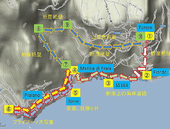 2)アマルフィ海岸の崖上自治体と崖下自治体の1日かけての現地踏査