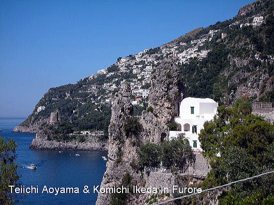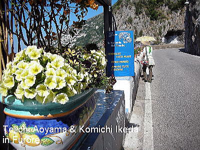 SS163号線は下の写真のようにアマルフィ海岸のシンボルロード、ここからはすばらしい景観が楽しめますが、結構、交通量も多く、本来、歩行は危険です。また車を運転しながらの見学は非常に危険なので、歩くのが一番です。