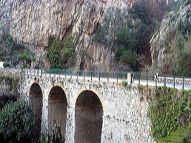 フローレ付近は崖が険しく、路線バスや車は断崖絶壁にへばりつく道路や橋の上を走ります。下の写真はSS163号線のアピンカーブの奧にある橋です。SS163号線は、この上を走り、プラアーノ方面に向かいます。