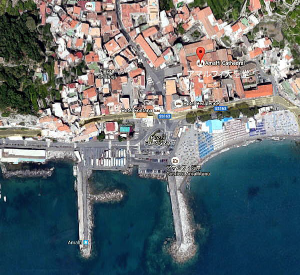 2013年アマルフィ海岸現地視察調査報告<125本 全体メニュー> アマルフィ海岸の位置 アマルフィの紋章 イタリア国旗 ◆歴史の生き証人アマルフィ大聖堂 ![]() アマルフィ大聖堂の位置 出典:グーグルマップ 次の大判の写真三枚は、海洋王国、アマルフィの守護神、アマルフィ大聖堂です。 この写真も2008年2月と2013年6月のものを並べてみました。いつきても世界中から多くのひとびとがこの大聖堂にお参りにきています。 アマルフィでひときわ異彩を放っている建築物がアマルフィ大聖堂(Duomo di Amalf)です。この大聖堂は海洋王国、アマルフィの守護神であり漁師の守り神である聖人アンドレアを奉じるために9世紀に建立されたものです。 ![]() カテドラルの最上部を拡大したもの 撮影:青山貞一、Nikon CoolPix S10 アマルフィ大聖堂は、アマルフィのまちを見下ろすよう57段の階段の上に建っています。大聖堂は2つの教会、地下室、階段、アトリウム、鐘楼(塔)、回廊などから構成された複合建築物として歴史建築学的にも希有なものとなっています。夕暮れともなると西日が正面のモザイクを金色に染めてとても美しくなります。大聖堂の建築様式は、当初ロマネスク様式でしたが、のちにバロック様式を取り入れています。 さらに教会の地下には聖人アンドレアの頭蓋骨が納められています。 大聖堂はアマルフィのまちでもっとも重要な広場に面している。教会の左にある鐘楼や天国の回廊(Chiostro del paradiso)はイスラム文化の影響を強く受けてお、あし。また塔は12世紀に建立されています。 ![]() イスラム様式の美しい幾何学模様。まさに天国の回廊である! 交差アーチをもつ天国の回廊(Chiostro del Paradiso) 撮影:青山貞一、Nikon CoolPix S10 なお、アマルフィ大聖堂の複合建築物の中核部分は当初、9世紀に造営されたものであると考えられてきましたが、その後596年という年代が書簡を法王が記していたことから、最初の建立は6世紀ではないかという説もあります。いずれにしても非常に古い年代に建立されたことに違いありません。 大聖堂の内部には、ローマ帝国が崩壊した後も、独立王国として君臨したアマルフィの富裕な歴史を物語るように豪華な司祭台(説教台)や燭台などがあります。 ![]() 大聖堂の内部。聖母マリア像 撮影:青山貞一、Nikon CoolPix S10 つづく |