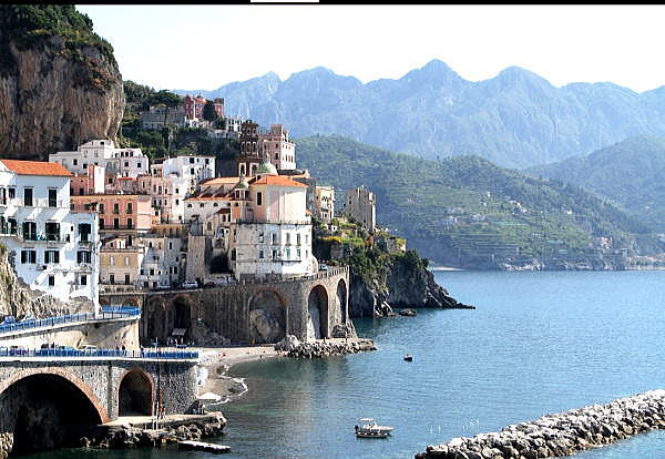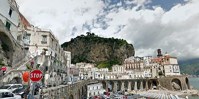 アトラーニ。谷間の背後はスカーラ(左上)とラヴェッロ(右上) Source:Wikipedia