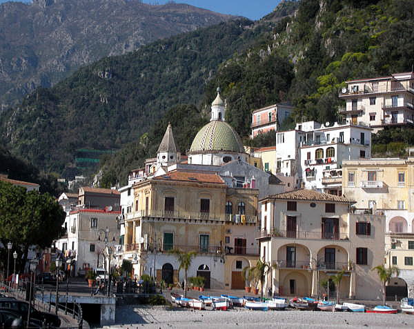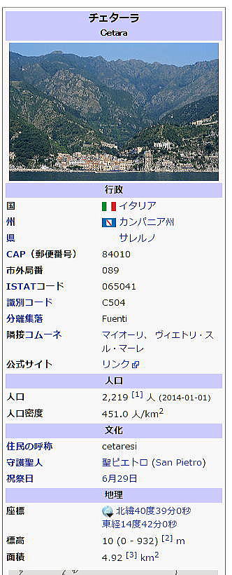 2013年アマルフィ海岸現地視察調査報告<125本 全体メニュー> アマルフィ海岸の位置 チェターラの紋章 イタリア国旗 ◆チェターラの生活と産業 アマルフィ海岸には約20のコムーネがありますが、下のグラフにあるようにチェターラの人口は1961年以降、2300人前後で増加と減少を繰り返しています。 このようなコムーネは他にはないようです。チェターラの人口は定常状態になっているのです。おそらくその理由は、チェターラでは、9世紀からつづく漁業が現在でも現役となっていること、その漁業、とくに片口鰯の魚醤が世界規模で販売されるなど、まさに小さいながらきらりと光るオンリーワンのまちづくりがその根底にあるからと推察できます。 ![]() アマルフィの人口推移 出典:Wikipedia Italiano ![]() 出典:Wikipedia ![]() チェターラの中心部 撮影:青山貞一 Nikon Coolpix S8 2013年6月 以下は、アマルフィ海岸自治体の基礎的データです。 チェターラの製造業組織数は13、その重要数は46人、またサービス業の組織数は70社で従業員数は119人です。一次産業組織数は47社で従業員数は149人となっています。これだけ小さなまちとして、いずれも充実しています。一次産業は多くが漁業と思われます。また製造業はおそらく漁業関連の魚加工業と推察できます。 表 南イタリア・アマルフィ海岸自治体の基礎的データ