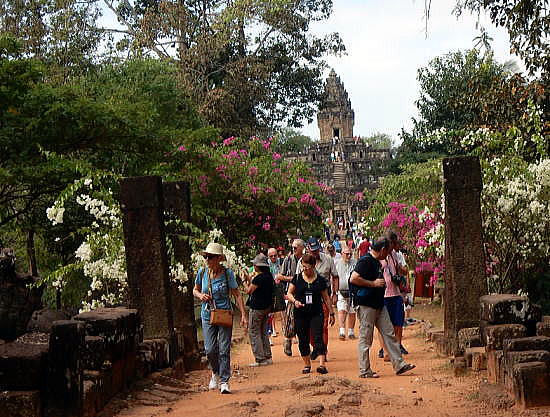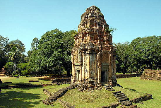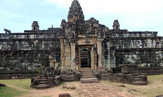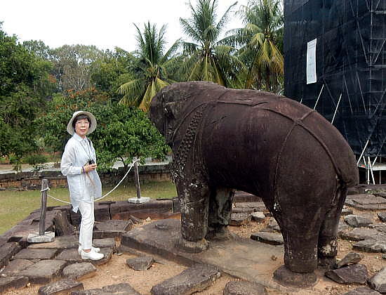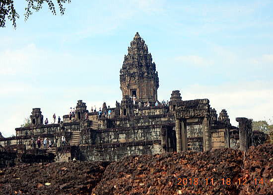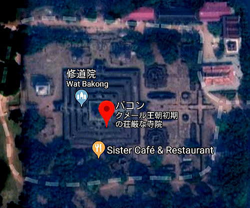 | アンコール遺跡全体目次 <南東部郊外の遺跡・寺院(ロリュオス)> プリア・コー1 プリア・コー2 バコン1 バコン2 バコン3 ロレイ1 ロレイ2 スピアン・プラプトス サンボー・プレイ・クック1 サンボー・プレイ・クック2 ◆バコン1(Bakong) 王都がアンコール地域に移る以前、ロリュオスに築かれた王都に「ロリュオス遺跡群」があります。 ロリュオス遺跡群内には最も大きな規模の「バコン」を中心に、王の両膝に捧げたとされアンコール遺跡最古の寺院「プリア・コー」、大貯水池インドラタターカの中央の「ロレイ」が建立されています。 私たちは、シェムリアップから半日とって、「バコン」、「プリア・コー」そして「ロレイ」のロリュオス遺跡群を参拝し、視察しました。 ![]() アンコール遺跡広域地図 ![]() ロリュオスのバコンなどの位置 ![]() 現地の3寺院位置図 ![]() バコン(Bakong)寺院全景 Source:Wikimedia Commons ![]() バコン(Bakong)寺院 出典:グーグルマップ バコン(Bakong)は、カンボジアにおける現代のシェムリアップに近いアンコールにおいて、クメール王朝の統治者によって構築された砂岩の山岳型寺院( temple mountain)です。 9世紀末の十数年間、今日、ロリュオスと呼ばれている地域に位置した古代の都ハリハラーラヤにおいて、王インドラヴァルマン1世(在位877-889年)の国家寺院としての役割を果たしました。 ![]() 撮影:青山貞一 Nikon Coolpix S9900 ![]() 撮影:青山貞一 Nikon Coolpix S9900 歴史 西暦802年、アンコール朝の初代の王ジャヤーヴァルマン2世が、カンボジアの主権を宣言しました。曲折の後、ジャヤーヴァルマン2世はハリハラーラヤにおいて彼の都城(首都)を制定しました。 数十年後、王の後継者は、アンコールにおける砂岩の最初の山岳型寺院として、バコン寺院を段階的に構築しました。石碑(分類 K.826)の碑文は、881年、王インドラヴァルマン1世がシヴァ神に寺院を捧げ、その中心に宗教的象徴であるリンガとして、その名前を王 (Indravarman) 自身と、シヴァ神 を表す接尾辞 "-esvara" の組み合わせであるインドレシュヴァラ神 (Sri Indresvara) を奉献したと述べています。 ジョルジュ・セデスによると、デヴァラージャ(神王)崇拝は、王権の正当性として神による王政という構想より成立したとしますが、後の著者は、それは必ずしも統治者自体の物理的な人物の崇拝を伴わないと述べています。 バコンは、わずか数年間、アンコールの国家寺院としての地位を享受しましたが、12世紀中頃ないし13世紀の後の造築は、それが放棄されなかったことを証明しています。 9世紀末にかけて、インドラヴァルマンの息子かつ後継者のヤショヴァルマン1世は、ハリハラーラヤから、現在アンコールとして知られるシェムリアップの北部地域に都城を移し、ここで彼はバケンと呼ばれる新しい山岳型寺院を中心に新都ヤショダラプラ(英語版)を建てました。 ![]() 中央のピラミッド型基壇を囲む煉瓦の塔は、ハリハラーラヤの他の寺院、プリア・コーやロレイに似ています。 Source:Wikimedia Commons ![]() 撮影:青山貞一 Nikon Coolpix S9900 構成 バコンの寺域は、東西900メートル、南北700メートルであり、2つの環濠と、東から西へ向かう主軸に区切られた3つの同心の周壁より構成されています。外周壁は、壁も塔門(ゴープラム)もなくなっており、その境界は今日、外側の濠が部分的に見られるのみです。 国道6号 (NH6) から現行の接続する道路は、第2周壁の端につながります。内濠が区域を画し、その内側の縁に、東西350メートル、南北320メートルのラテライトの周壁の跡と4つの十字形の塔門、それに広い土手道が交差して、その両脇にはナーガの欄干の原型のような7つの頭を持つナーガが並んでいます。2つの濠の間には、26基の付随する煉瓦の小祠堂の遺跡があります。 最も内側の周壁は、160メートル×120メートルのラテライトの壁で囲まれ、中央に寺院ピラミッドがあって、シヴァ神に捧げられた東向きの8基の煉瓦の塔の祠堂が、各面に2基ずつその周りにあります。 それら煉瓦の祠堂の扉口の枠や柱、偽扉は砂岩で造られ、まぐさ(リンテル)には精巧な浮彫りが見られます。また、ドヴァラパーラ(門衛神)やデヴァタ(女神)の塑像が側面にあります。その他いくつものより小さい構造物もまた周壁内に配置されている。東塔門のすぐ外側には、現代の仏教寺院があります。 ![]() 撮影:青山貞一 Nikon Coolpix S9900 ![]() 外を向いたシンハの像が、中央ピラミッドの石段にあり各基壇を守る。 Source:Wikimedia Commons このシンハの像はめずらしく尻尾が完全な形でのこっています。その他のシンハ像はほとんど尻尾が途中で壊れているものばかりでした。 ![]() 撮影:青山貞一 Nikon Coolpix S9900 ピラミッド型の基壇は5層からなり、その第1層の基壇は65メートル×67メートルです。その中央部は1936年から1943年に、フランスのモーリス・グレーズによって、アナスティローズの技法により再建されました。 頂上部にはかなり後に再建された塔が唯一1基あり、その様式はハリハラーラ