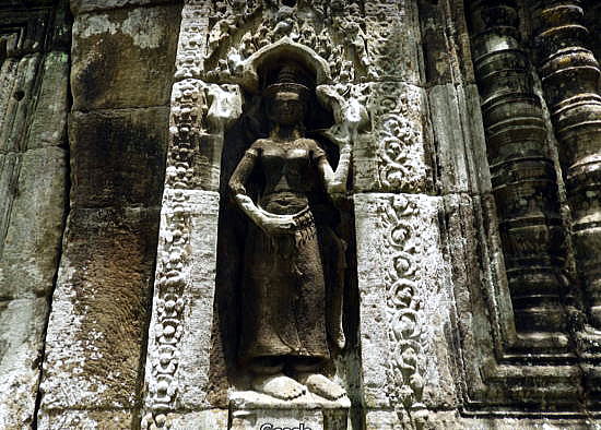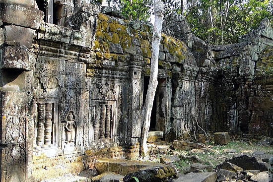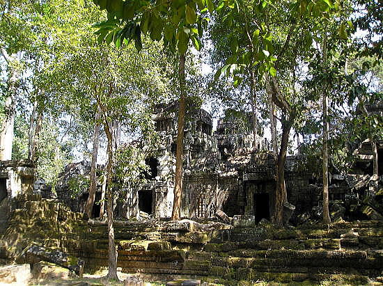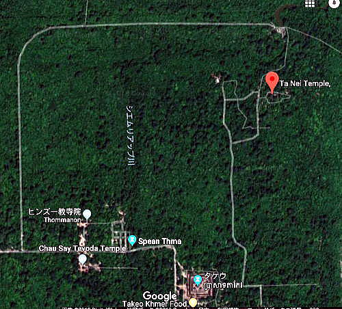 | アンコール遺跡全体目次 <東部の寺院・遺跡2> タ・ネイ プレ・ループ 東バライ 東メボン プラサット・クラヴァン1 プラサット・クラヴァン2 ◆タ・ネイ (Ta Nei) タ・ネイ(Ta Nei)は、カンボジアのアンコールにある12世紀後半の石造りの寺院です。 ジャヤヴァルマン7世王の治世中に建てられました。タ・ネイは東バライの北西隅、大きな聖なる貯水池の近くにあります。 それは仏に捧げられました。 ![]() アンコール遺跡・寺院地図 タ・ネイの位置は、タ・ケウの北北東であり、湯っくためには、タ・ケウから北上する方法と、勝利の門を東に向かい、途中トマノンの手前で左折し北上、道なりに東に進む方法があります。ただし、タ・ケウを北上する道は、途中道幅が非常に狭くなります。 ![]() 出典:グーグルマップ 下はタ・ネイ寺院へのアクセスマップです。 ![]() 出典:グーグルマップ 下はタ・ネイの遠景です。 ![]() 寺院の主要建築物群 Source:Wikimedia Commons 平面 ![]() タ・ネイ、絵のような遺跡 Source:Wikimedia Commons タ・ネイは最初、東に向かって伸びていましたが、その後、北、西、南に3つの小さなゴープラ(楼門/塔門)と、本質的に内側のガレエ状の囲いの一部である大きな東ゴープラ(楼門/塔門)で拡大されました。 タ・プロームでのように、城壁づくりも行われましたが、おそらく完成したことはなかったとされています。 今日、西と東には2つの外側にゴープラだけが存在します。 寺院の囲いの長さは190mです。 中と南と北に2本の細長いタンクの堀があります。 元の東ゴープラは現在、孤立しています、そして元の北東と南東の角の塔は今ギャラリーの一部となっています。 南側近くに小さな図書館があり、聖域と北ゴープラをつなぐ部屋があります。 以下は、タ・ネイの写真ギャラアリーです。出典はグーグルマップ・ストリートビュー、撮影者は冒頭に示しています。 ![]() 出典: Kris Angelo、グーグルマップ・ストリートビュー ![]() 出典: Peter Westoo、グーグルマップ・ストリートビュー ![]() 出典: Lyda Hak、グーグルマップ・ストリートビュー ![]() 出典:Shark-Cat M、グーグルマップ・ストリートビュー ![]() 出典:Alexander Belozerov、グーグルマップ・ストリートビュー プレ・ループにつづく アンコール遺跡全体目次 |