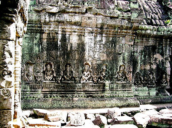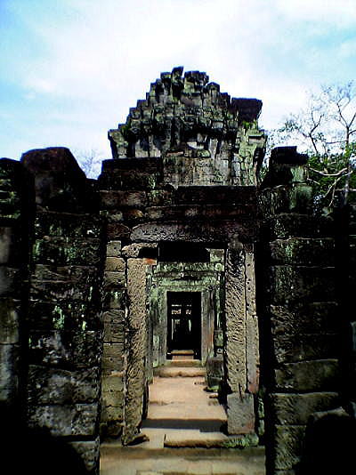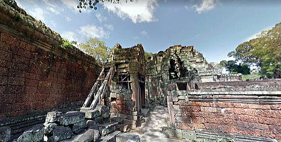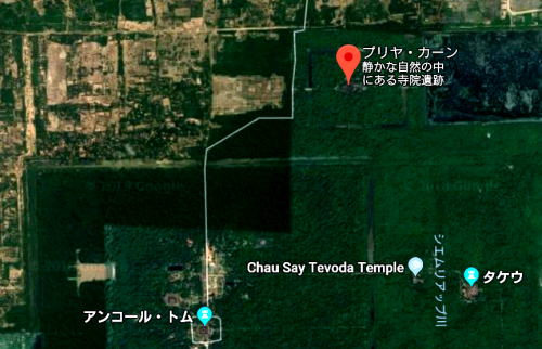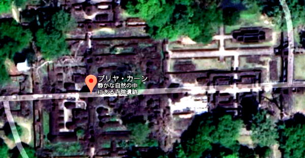 | アンコール遺跡全体目次 <北部の寺院・遺跡> プリヤ・カーン プリア・ピトゥ1 プリア・ピトゥ2 ◆プリヤ・カーン (Preah Khan) プリヤ・カーン (Preah Khan) は、カンボジアにあるアンコール遺跡の一つで、仏教とヒンドゥー教の習合寺院です。 名は「聖なる剣」を意味し、かつて境内で発見された剣に由来します。アンコール・トムの北東に位置します。 ![]() アンコール遺跡・寺院地図 下はプリヤ・カーン (Preah Khan) の位置を示しています。アンコール・トムの北東にあります。 ![]() プリヤ・カーン (Preah Khan) 寺院 出典:グーグルマップ 下の衛星写真は上の写真をズームアップしたものですが、プリヤ・カーンはもともと相当大きな規模の寺院であったことが分かります。 ![]() プリヤ・カーン (Preah Khan) 寺院 出典:グーグルマップ 下はプリヤ・カーン (Preah Khan)寺院ですが、以下の写真のようにすでにかなりの程度廃墟となっています。 ![]() 出典:グーグルマップ・ストリートビュー ![]() 出典:グーグルマップ・ストリートビュー 歴史 この地はかつてヤショヴァルマン2世の王宮が建てられており、寺院を建立したジャヤーヴァルマン7世は、王宮を支配していたチャンパ王国のジャヤ・インドラヴァルマン4世をここで戦って討ち、その跡に自らの父を模して彫らせた観世音菩薩像を1191年に安置しました。 かつて寺院には千人以上の僧侶が住み、それを支える荘園が与えられ、そこには97,840人が暮らしていたといいます。 ヒンドゥー教の神々や土地の聖霊らも境内に祀られていましたが、後にヒンドゥー教を信じるジャヤーヴァルマン8世により仏像は破壊されました。今はカンボジアの国教である仏教の僧侶らが境内で祈祷を行っています。 溶樹の繁殖や彫像の盗難による損壊が大きく、今も修復が行われていますが、カンボジアの安定に伴い多くの観光客が訪れています。 名の由来となった聖なる剣は、プノンペンの国立博物館に収められています。 伽藍 位置はアンコール・トムの北大門から1.5kmほど道を北東に進んだ右手に在ります。寺院はラテライトと砂岩で築かれており、境内は平面で環濠に囲まれ、東西800m南北700mの広さを持っています。 ![]() 壁面に彫られた観世音菩薩 Source:Wikimedia Commons ![]() 東からの参道 Source:Wikimedia Commons ![]() 中庭 Source:Wikimedia Commons 環濠を渡る橋は他の多くのアンコール遺跡と同じく、乳海攪拌の様子を彫った欄干で飾られており、大蛇とそれを引く神々と阿修羅が見られます。 本殿は三重の周壁に囲まれており、東西南北からの参道を持つが、南北の参道は崩壊し通行できません。かつて周壁はそれぞれ塔門を備えていたといいますが、これも崩れ落ちています。周壁の門は本殿に近づく程に間口と高さを狭め、遠近法により寺院を広く見せています。 参拝は東の参道から行われており、その途路では壁面に刻まれた仏の観世音菩薩やヒンドゥー教のリンガが見られます。参道を抜け中庭に出ると、大蛇の欄干で縁取られたテラスが在ります。また中庭の南側にはアンコール遺跡において珍しい、円柱を持つ二階建ての経蔵が残っています ![]() 円形の経蔵 Source:Wikimedia Commons プリア・ピトゥ1につづく アンコール遺跡全体目次 |