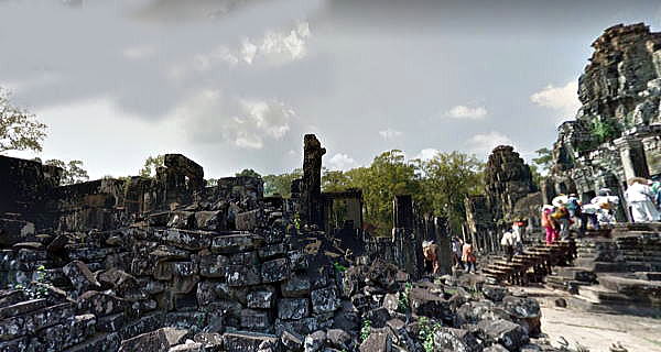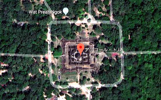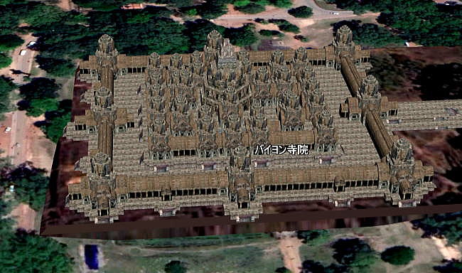 | アンコール遺跡全体目次 <アンコール・トム> アンコール・トム 南北門 東西門 王宮 ピミアナカス バイヨン1 バイヨン2 バイヨン3 バイヨン4 象のテラス1 象のテラス2 象のテラス3 ライ王のテラス1 ライ王のテラス2 ライ王のテラス3 プラサット・スゥル・プラット クリアン1 クリアン2 バプーオン1 バプーオン2 ◆バイヨン1 (Bayon) バイヨン (Bayon) は、カンボジアのアンコール遺跡を形成するヒンドゥーと仏教の混交寺院跡でありアンコール・トム全体敷地の中央にあります。 一般的にはバイヨンの呼び方で広く知られていますが、クメール語の発音ではバヨンの方が近いと言えます。バは「美しい」という意味で、ヨンは「塔」の意味を持っています。 ![]() アンコール遺跡・寺院地図 ![]() アンコール・トムとバイヨンの拡大図 下はグーグルマップの衛星写真で見たバイヨンです。アンコール・トムの中心にあり、正方形をしており、その中央に祠堂があります。また周囲に道路があります。 ![]() 出典:グーグルマップ 以下はバイヨンの写真ですが、ひときわ高い建築物が中央祠堂です。 ![]() バイヨン寺院 出典:グーグルマップ・ストリートビュー ![]() バイヨン寺院 Source:Wikimedia Commons 見る角度により中央祠堂の高さは変わります。以下の池田が写っている写真では、中央祠堂はひときわ高く見えます。 ![]() 撮影:随行学芸員 Nikon Coolpix S9900 ![]() バイヨン Source:Wikimedia Commons ◆バイヨンの構造 ・3次グラフィックスによるバイヨン寺院の展開 下の2枚はグーグルアースによる3次元グラフィックスによるバイヨン寺院の展開です。正方形の敷地の中に完全にシンメトリーに伽藍(祠堂、塔、門)が配置されています。方位は上が北です。 こうしてみることで、外観からは非常に複雑に見えるバイヨンの土地利用、施設配置、設計がよくわかります。 ![]() グーグルアースによる3次元グラフィックスによるバイヨン寺院の展開 ![]() グーグルアースによる3次元グラフィックスによるバイヨン寺院の展開 下は、バイヨン寺院の平面図です。以下の平面図の凡例から敷地の東側上下に、経蔵(Library)があることが分かります。 ![]() 全体図 Source:Wikimedia Commons ![]() 全体図 Source:Wikimedia Commons ◆バイヨンの特徴 バイヨンを特徴付けているのは、高くそびえる中央祠堂をはじめ、塔の4面に彫られている人面像(バイヨンの四面像)です。人面像は観世菩薩像を模しているというのが一般的な説です。 しかし戦士をあらわす葉飾り付きの冠を被っていることから、ジャヤーヴァルマン7世を神格化して偶像化したものであるとする説も存在します。また21世紀に入り、3次元CG化と解析によりヒンドゥー教の神々を表しているという説も出ました。この像はクメールの微笑みと呼ばれています。 また他のアンコール遺跡に残るクメール建築と同じく疑似アーチ構造を多用した建築構造をもっています。 建築全体ではおおむね三層に分かれており、高さ約43メートルといわれる中央祠堂を中心に、その第一層に二重の回廊が配置された構造となっています。 50近い塔に合わせて117個の人面像が残っています(これには異説があるようです)。人面像の高さは1.7〜2.2メートル程度で、個々にばらつきがあります。 第一層 第一層には東西南北全方向に門があります。中でも東門の近くには両側に池のあるテラスがあります。 第一回廊にもレリーフが残ります。アンコール・ワットにも存在する乳海攪拌のレリーフなどですが、保存状態があまり良くありません。 第二回廊(外回廊)は約160メートル×120メートル。正面は、東側を向いています。現在残るレリーフは、他のアンコール遺跡とは大きく異なった特徴を持っています。 第二回廊にはチャンパとの戦争の様子やバイヨン建設当時の市場の様子や狩の様子などがレリーフに彫り込まれており、庶民の暮らしを窺い知ることのできる貴重な資料にもなっています。 第二層 16の塔があり、どの塔にも前述の観音菩薩と思われる四面像が彫られています。第二層の回廊にはヒンドゥー教色の強いレリーフがデザインされています。 第三層 第三層はテラスとなっており、やはりどの塔にも観音菩薩とおぼしき四面像が彫られています。第三層の中央には過去にシヴァリンガが置かれていたとされていますが、後世の人が除去し、現在では上座部仏教(小乗仏教)の像が置かれています。 ![]() バイヨン寺院の人面像 Source:Wikimedia Commons ![]() バイヨン寺院 出典:グーグルマップ・ストリートビュー ![]() バイヨン寺院 出典:グーグルマップ・ストリートビュー ◆バイヨンの歴史 アンコール王朝の中興の祖と言われるジャヤーヴァルマン7世がチャンパに対する戦勝を記念して12世紀末ごろから造成に着手したと考えられており、石の積み方や材質が違うことなどから、多くの王によって徐々に建設されていったものであると推測されています。 当初は大乗仏教の寺院でしたが、後にアンコール王朝にヒンドゥー教が流入すると、寺院全体がヒンドゥ