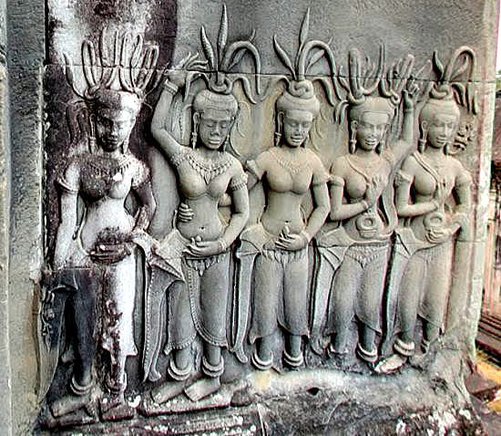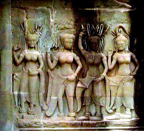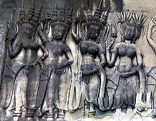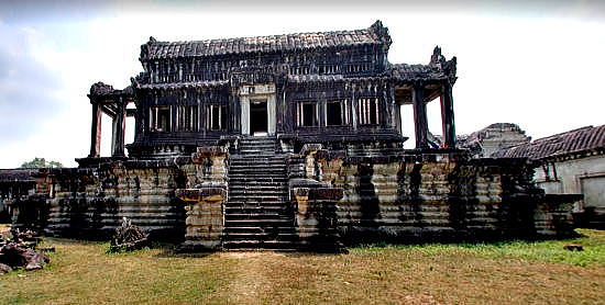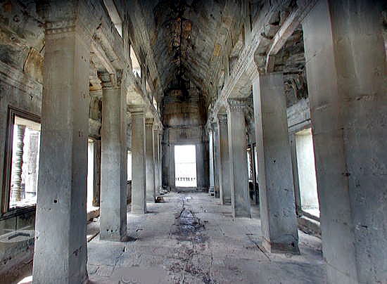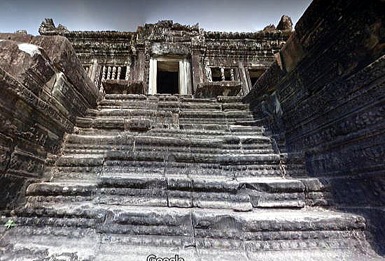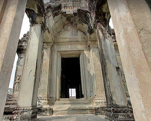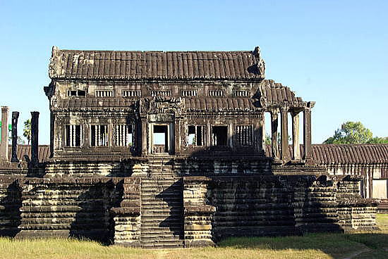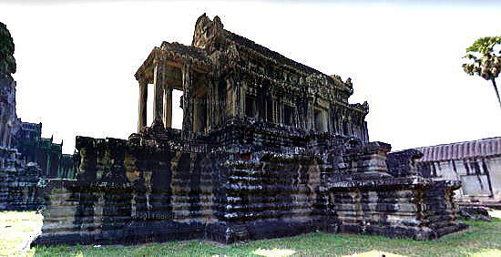 | アンコール遺跡全体目次 <アンコール・ワット> はじめに 東門 第1回廊 第2回廊 第3回廊、中央祠堂 十字回廊 千神経蔵 前庭 経蔵・西門 概要 歴史 修復活動 ◆南北千神経蔵(North and South Thousand God Library) ![]() アンコール・ワット平面全図 ![]() 南北経蔵の位置 十字回廊の南北それぞれ少し離れて北千神経蔵(North Thousand God Library)と南線神経蔵(South Thousand God Library)があります。この経蔵の外壁には多数のデヴァタが掘られています。 ここでは、デヴァタは一人ではなく、3人、4人、5人と並んで、手を取り合ったり腰に手を回したりしている構図が特徴となっています。どのデヴァタも口元に微笑みを湛えているところも見所です。 下の写真は北千神経蔵ですが、南千神経蔵も同じ形で入口はアンコール・ワットの南北中心線を向いています(上の3次元CG参照)。 なお、経蔵とは、仏教の聖典(仏典・三蔵)の一部であり、釈迦の教説である経をまとめたものです。また、建築物的には経蔵は、仏教寺院における建造物(伽藍)のひとつで、経典や仏教に関する書物を収蔵するものであり、経堂・経庫などとも称され、仏教寺院の主要伽藍である七堂伽藍のひとつに上げられることもあります。 ただし、英語では、単にLibraryと表記されます。 ![]() 北経蔵の外観 Source: Wikimedia Commons CC BY-SA 3.0, Link ![]() 北経蔵の階段 出典:グーグルマップ・ストリートビュー ![]() 北経蔵外観 出典:グーグルマップ・ストリートビュー 以下は南千神経蔵の外観写真です。 ![]() 南経蔵の外観 出典:グーグルマップ・ストリートビュー ![]() 南経蔵の内部 出典:グーグルマップ・ストリートビュー ![]() 南経蔵の入口 出典:グーグルマップ・ストリートビュー 下は南経蔵から第1回廊(右)と第2回廊(左)を撮影したものです。 ![]() 出典:グーグルマップ・ストリートビュー ◆外壁のデヴァタ(Devat) 下は北経蔵の外壁にあるデヴァタです。 ![]() 北経蔵の外壁にあるデヴァタ 出典:グーグルマップ・ストリートビュー ![]() 南経蔵の外壁にあるデヴァダ 出典:グーグルマップ・ストリートビュー ![]() 南経蔵の外壁にあるデヴァダ 出典:グーグルマップ・ストリートビュー ![]() 南経蔵の外壁にあるデヴァダ 出典:グーグルマップ・ストリートビュー ![]() 南経蔵の外壁にあるデヴァダ 出典:グーグルマップ・ストリートビュー ![]() 南経蔵の外壁にあるデヴァダ 出典:グーグルマップ・ストリートビュー 南千神経蔵のさらに南に、外部回廊(Outer Gallary)があります。その外壁にも以下のデヴァダがありました。 ![]() 南千神経蔵のさらに南側にある回廊にあったデヴァダ 出典:グーグルマップ・ストリートビュー 前庭につづく アンコール遺跡全体目次 |
