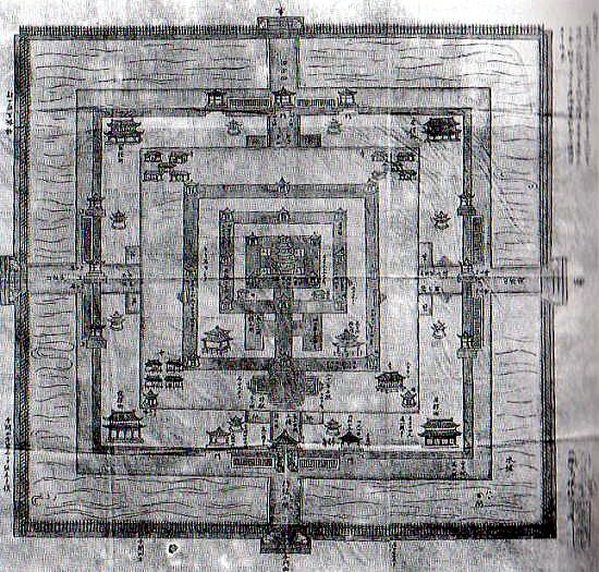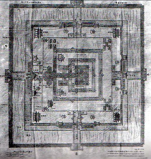| アンコール遺跡全体目次 <アンコール・ワット> はじめに 東門 第1回廊 第2回廊 第3回廊、中央祠堂 十字回廊 千神経蔵 前庭 経蔵・西門 概要 歴史 修復活動 ◆アンコール・ワットの歴史 アンコール・ワットは12世紀前半、アンコール王朝のスーリヤヴァルマン2世によって、ヒンドゥー教の寺院として30年を超える歳月を費やし建立されました。 1431年頃、アンコールが放棄されプノンペンに王都が遷ると、一時は忘れ去られますが、再発見され、アンチェン1世は1546年から1564年の間に未完成であった第一回廊北面とその付近に彫刻を施しました。 孫のソター王は仏教寺院へと改修し、本堂に安置されていたヴィシュヌ神を四体の仏像に置き換えたといいます。 以下は日本の巡礼者によって作られた大変貴重な絵地図(1623年 - 1633年)です。図は、下が西、上が東、左が北、右が南となっています。 よく見ると、四隅にも伽藍が配置され、門やその周辺は現在よりはるかに、伽藍があることが分かります。さらに第一回廊、第二回廊、第三回廊、中央祠堂などの主要な伽藍もしっかり書き込まれています。 ![]() 日本の巡礼者によって作られた地図(1623年 - 1633年) Source: Wikimedia Commons パブリック・ドメイン, リンクによる 下の図は、上を北にしたものです。 ![]() 日本の巡礼者によって作られた地図(1623年 - 1633年) Source: Wikimedia Commons ちなみに下の伽藍配置図は上が北となっています。 ![]() アンコールワット平面全図 1586年、ポルトガル人のアントニオ・ダ・マダレーナが西欧人として初めて参拝し、伽藍に対する賛辞を残しています。 1632年(寛永9年)、日本人の森本右近太夫一房が参拝した際に壁面へ残した墨書には、「御堂を志し数千里の海上を渡り」「ここに仏四体を奉るものなり」とあり、日本にもこの仏教寺院が知られていたことが伺えます。 以下に森本右近太夫一房を紹介します。
