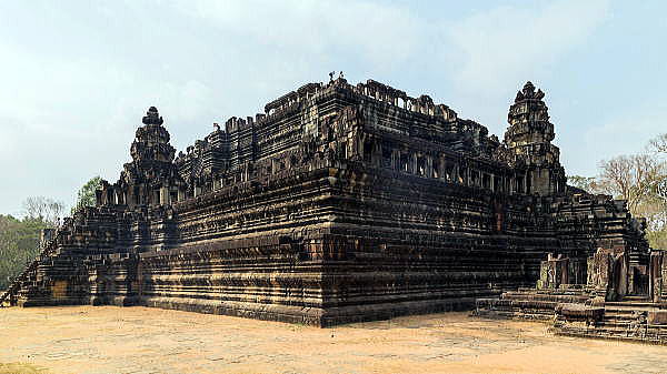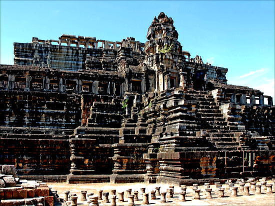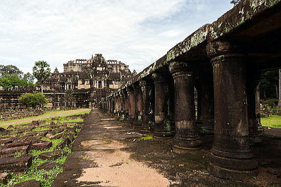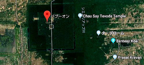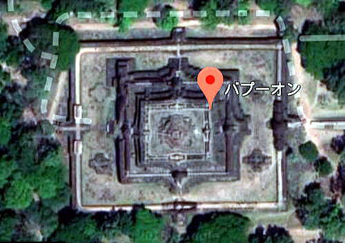 | アンコール遺跡全体目次 <アンコール・トム> アンコール・トム 南北門 東西門 王宮 ピミアナカス バイヨン1 バイヨン2 バイヨン3 バイヨン4 象のテラス1 象のテラス2 象のテラス3 ライ王のテラス1 ライ王のテラス2 ライ王のテラス3 プラサット・スゥル・プラット クリアン1 クリアン2 バプーオン1 バプーオン2 ◆バプーオン1(Baphuon) バプーオン(Baphuon)は、カンボジアのアンコール遺跡にある寺院の1つであり、アンコール・トムにあるバイヨンの北西に位置しています。 11世紀中頃の1060年頃、ヒンドゥー教の神シヴァに捧げられ、ウダヤーディチャヴァルマン2世(在位1050-1066年)の国家的寺院として築かれました。3層からなる山岳型(ピラミッド型)寺院で、バプーオン様式の原型です。 ![]() アンコール遺跡・寺院地図 ![]() アンコールトムとバーブオンの位置 以下は、グーグル衛星写真でみたバーブオンです。 ![]() バプーオンの位置 出典:グーグルマップ ![]() バプーオンの位置 出典:グーグルマップ ![]() バプーオンの位置 出典:グーグルマップ 以下はバプーオンの外観写真です。 ![]() Baphuon. Angkor Thom, Siem Reap Province, Cambodia. Source:Wikimedia Commons ![]() ウダヤディチャヴァルマン(Uaphadityavarman)2世の治世中に砂岩で建てられた11世紀の半ばに遡る3階建てのバプーオン・シヴァイテ寺院の山の東側ファサード。16世紀には、寺院は西側ファサードの上に大きな仏層を建てるための採石場として機能しました。 EFEOは1960年にこの寺院の修復を開始し、2011年に完成しました。戦争により1970年から1992年の間は中断していました。崩壊、植生の侵入、クメール・ルージュによる建築敷地の遺跡の破壊、地下室の不安定性、壁の変形、水の浸入、時間の経過による改造、地下室の補強など、困難なことは無数にありました。目に見えないように後背部に鉄筋コンクリートの支柱で支えて補強しました。この目的を達成するために、すべてのファサードをいったん別の場所に除けて作業しました。(意訳) Source:Wikimedia Commons 以下はバプーオンの遠景写真です。 ![]() バプーオン、アンコール・トム、シェムリアップ州、カンボジア Source:Wikimedia Commons ◆バプーオンの構成 バーブオン寺院は、王宮の周壁の南側に隣接し、東西425メートル、南北125メートルにおよぶ砂岩の周壁に囲まれています。王宮前広場の南端にあるその東塔門から長さ200メートル、橋脚の高さ約1メートルの参道が内側の塔門に向かって延びています。 途中に十字形のテラスがあるこの参道は、3列に並ぶ円柱の橋脚とともに、ほとんど崩壊していましたが、フランス極東学院 (EFEO) によって修復されました。 須弥山(メル山)を象徴する山岳型寺院であり、その基盤は東西120メートル、南北100メートルにおよびます。3層の基壇の上は回廊で囲まれ、中央祠堂が1基あります。高さは34メートルでありますが、およそ50メートルの高さに至る塔があったとされます。 ![]() バプーオン寺院平面図 Source:Wikimedia Commons その特徴のある外観は、13世紀末、元の皇帝・成宗の使節であった周達觀が1296年から1297年にかけて訪問した際の『真臘風土記』に記され、「銅塔一座(バプーオン)があり、金塔(バイヨン、高さ45メートル)に比べて更に高い」とあります。また、この「銅塔」から、もとは銅葺きであったとも考えられます。 15世紀後期、バプーオンは仏教寺院に改められ、長さ70メートル、高さ9メートルの涅槃仏像が西側の第2層に建造されましたが、おそらくそれには以前8メートル以上におよんだ塔を取り壊す必要があったことが、現在その塔がない理由とされています。 バプーオン寺院は砂に覆われた敷地に建造され、またその巨大な規模によって、その立地は寺院の歴史を通して不安定でした。大部分はおそらく寝釈迦像が付け加えられた頃にはすでに崩壊していました。 ◆バプーオンの修復 ![]() 修復された円柱の橋脚と参道 Source:Wikimedia Commons 20世紀には、寺院の大部分がほとんど崩壊しており、また、1920年代の修復の取り組みはその後問題をみせました。1960年にフランスの考古学者ベルナール=フィリップ・グロリエのもとで始まった取り組みは、クメール・ルージュが勢力を得ることにより1972年に中断され、石材の位置についての記録は失われました。 1994年2月、再びフランス極東学院 (EFEO) の考古学者チームにより修復が開始されました。修復の継続中は訪問者の入場を制限していましたが、 2010年11月になって、部分的な訪問者の入場が、中央の建造物を除いて再び許可されました。 2011年4月、1960年より51年を経て、考古学者らは寺院の修復を終えました。カンボジアの国王ノロドム・シハモニとフランスの首相であったフランソワ・フィヨンはともに、2011年7月3日の公開式典において復元された寺院を最初に見学しました。 一般公開も開始されましたが、観光客が転落したことより、安全面に関する検証のため一時閉鎖され、その後同年11月14日に一般訪問者の入場が再開されるようになりました。 バ
