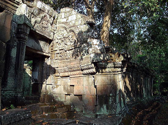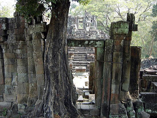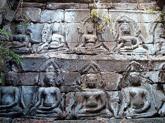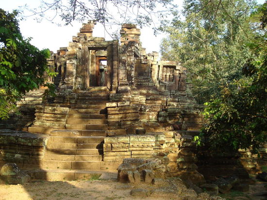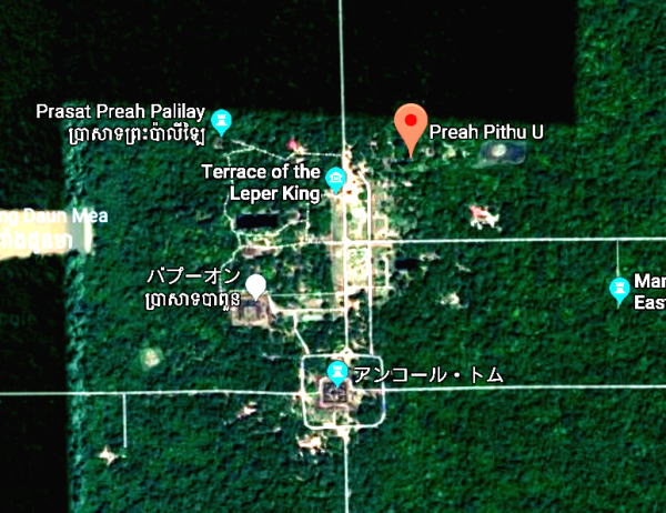 | アンコール遺跡全体目次 <北部の寺院・遺跡> プリヤ・カーン プリア・ピトゥ1 プリア・ピトゥ2 ◆プリア・ピトゥ1(Prah Pithu) プリア・ピトゥ(Prah Pithu)は、カンボジアのアンコール遺跡における5つの寺院からなる寺院遺跡群です。 ![]() アンコール遺跡・寺院地図 プリア・ピトゥ(Prah Pithu)は、アンコール・トムのすぐ北に位置しています。 ![]() 出典:グーグルマップ プリア・ピトゥは下図のように、プリア・ピトゥT、プリア・ピトゥU、プリア・ピトゥV、プリア・ピトゥXと4つの離れた寺院から構成されています。 ![]() 出典:グーグルマップ ![]() glimpse of Temple "T" - Preah Pithu group Source:Wikimedia Commons 遺跡 プリア・ピトゥ(Prah Pithu)の寺院群は、アンコール・トムにあるバイヨンの北、テップ・プラナム (Tep Pranam) の前方(東)に位置します。 その寺院群は近接していますが、それらは2つを除いて、同時代に建造されたものではなく、12世紀前半-13世紀頃(13-14世紀)、スーリヤヴァルマン2世(在位1113-1150年)からジャヤーヴァルマン8世(在位1243-1295年)の時代にかけて構築された寺院群とされています。しかし年代の特定には至っておらず、その順列は明らかではありません。 それらの寺院は T、U、X、V、Y のアルファベットで分類されています。「X」は仏教寺院であり、それは未完成のままでおそらく最も後期のものです。その他はヒンドゥー教寺院です。 5つの寺院は状態が悪く、上層部は崩壊していますが、それらの彫刻は興味深いものであり、またその場所は静寂に包まれ、樹木が茂ってほとんど人はいません。大抵は涸れている濠が、寺院群の一部を取り囲んでいます。それらはまず1908年に Jean Commaille により、その後1918年から1920年にアンリ・マーシャルによって整備されました。 ![]() プリア・ピトゥ寺院群の構成 Source:Wikimedia Commons 寺院「T」・「U」 ![]() 寺院Tと少年僧 Source:Wikimedia Commons これらの寺院はまず間違いなく同時に建造されたもので、同じ東西軸上にあり、単一の濠によって囲まれています。 それらは西を向いており、入口にはナーガの欄干と2つの基壇に十字型のテラスがある。寺院「T」は、東西45メートル、南北40メートルの砂岩の周壁を持ち、東西の主軸上に2つの塔門(ゴープラム〈ゴープラ〉)があります。 聖所は、高さ約6メートルの[5]装飾された3層の基壇上にあり、その台座の上にある大きなリンガを保護した祠堂を持っています。地上にある西側の扉のまぐさ(リンテル)の断片には、「乳海攪拌」を様式化した描写が見られ、壁はデヴァターや花の模様が、バイヨン様式で装飾されています。 寺院「U」は「T」に似るが、より小さくて[5]簡素です。その周壁は東西35メートル、南北28メートルで塔門はありません。2層の基壇上に祠堂があり、西の扉のまぐさは、ヴィシュヌとブラフマーの間に、カーラ(kala、キールティムカ)の頭で踊るシヴァのいる三神一体を示しています。 内壁にはドヴァラパーラが彫られており、柱の基部の盲アーチはアンコール・ワットの時代に特有なものです。 北側のまぐさには「乳海攪拌」のもう一つの描写があります。 寺院「X」 ![]() 寺院 X 聖室内にある2列の仏陀像 Source:Wikimedia Commons 寺院「X」は、寺院「U」の約100メートル東にあり、一辺40メートル、高さ4メートルの大きな基壇上に建っています。濠が涸れている場合は真っ直ぐに到達可能です。 その様式は前述の寺院と同様であるが、より大きくかつその装飾は不完全です。「X」は仏教寺院であり、聖室の壁には、彫刻された二列の仏陀像があります。さらにまぐさは仏教のモチーフを示しています。 しかしながら最も関心を引く遺構である有名な釈迦の断髪を描くものはそこにはありません。東に向かうラテライトのテラスは結界石(シーマ石、sema 〈仏の形象描写の刻まれた境界石〉)によって囲まれ、聖域の境界を定めていまあす。 寺院「V」 ![]() 寺院V Source:Wikimedia Commons 寺院 Vは残存する濠の外側、寺院「U」の北に、寺院「V」はあります。それは東に向いており、二重の前庭より始まり、周壁はありません。西には渡り参道があり、それは長さ40メートルの十字型テラスに終わって、王宮広場の北東の角に通じています。 その聖室は、2層の彫刻された基壇上に建ち、寺院群のうち最も大きく3.8メートル四方で、大きな1.5メートルのリンガを祀っています。そのアンコール・ワット様式の外部の装飾は未完成です。 寺院「Y」 ![]() 寺院 Y 南側の半フロントン Source:Wikimedia Commons 寺院「Y」は、基壇や階段を持たず、「V」の北側の、土でできた台地の上に建っています。それはアンコール・ワットの時代からバイヨンの時代の間のものです。 東に向かって、入口としての長い拝殿(マンダパ、mandapa) があり、前庭によって高さ0.95メートルのリンガを祀った3.5×3.0メートルの聖室につながっています。 より大きな部屋はほとんど崩壊していますが、その西側には2つの注目すべき半フロントン(fronton、ペディメント〈破風〉)があり、北にクリシ