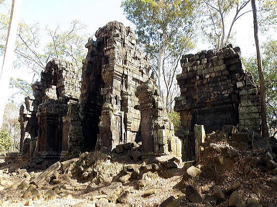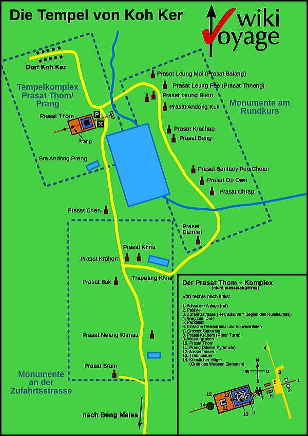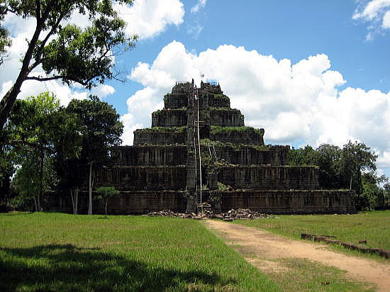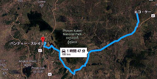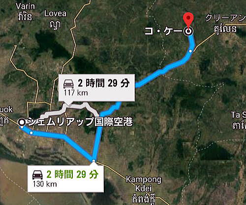 | アンコール遺跡全体目次 <北東部郊外の寺院・遺跡> バンテアイ・スレイ1 バンテアイ・スレイ2 バンテアイ・スレイ3 バンテアイ・スレイ4 バンテアイ・スレイ5 プノン・クーレン クバール・スピアン1 クバール・スピアン2 クバール・スピアン3 べンメリア1 べンメリア2 ベンメリア3 ベンメリア4 コーケル1 コーケル2 コーケル3 コーケル4 コーケル5 ◆コーケル(Koh Ker)の場所と行き方 コーケル(Koh Ker)遺跡はシェリムアップやアンコールワットから北東に約100〜120kmの位置にあります。 以下のグーグルマップは、シェムリアップ国際空港からコーケルまでを車で行く場合のルート、距離、時間です。距離は117km、時間は2時間29分となっています。 ![]() 出典:グーグルマップ 以下はベンメリア寺院遺跡からコーケル寺院遺跡に行く場合です。距離は58km、時間は1時間2分といずれも約半分となります。 ![]() 出典:グーグルマップ さらに、以下はバンテアイ・スレイ寺院遺跡からコーケル寺院遺跡に行く場合です。距離は106km、時間は1時間47分となります。 ![]() 出典:グーグルマップ ◆コーケル(Koh Ker)の概要 以下はコーケルを上空から撮影した衛星写真です。 ![]() 出典:グーグルマップ 上の写真をさらに拡大してみると、以下のようにコーケルには広大な敷地に多数の遺跡があることが分かります。 ![]() 出典:グーグルマップ さらに、以下はコーケル遺跡の詳細な伽藍の配置図です。 ![]() 出典:Wiki Voyage 下はこのコーケルを有名にしたピラミッド、プラサット・トム寺院です。 ![]() プラング(プラサット・トムの背後)、ジャヤバルマン4世(928〜941年) 時代の国寺、カンボジア、コーケル Source:Wikimedia Commons ![]() Vieコーケルの7段ピラミッドの眺め Source:Wikimedia Commons コーケル(Koh Ker)遺跡は、シェムリアップから北東へ120kmほどのところにあります。 約30の寺院遺跡や塔の遺跡からなる遺跡群で、アンコール王朝の中でもわずかな年数しか都として使われず、長い間ひっそりと放置されたままだったことから、幻の遺跡とも言われています。 奥地に建っているということもあり、手つかずのまま残された遺跡です。地雷撤去が進み、観光客も訪れることができるようになりました。しかし、まだアクセス手段が確立されていないので、観光客は少ない遺跡でもあります ![]() Un des nombreux temples du site de Koh Kerr Source:Wikimedia Commons ![]() カンボジア、コーケル遺跡にある多くの寺院の1つであるバンテアイ・ピチャン (Banteay Pichean)の見所 Source:Wikimedia Commons ![]() 出典:グーグルマップ・ストリートビュー ![]() PTrapeang Roseiの十字型の間取りをした大きな神殿 出典:グーグルマップ・ストリートビュー コーケル2につづく アンコール遺跡全体目次 |