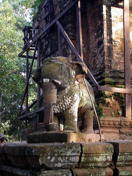 | アンコール遺跡全体目次 <北東部郊外の寺院・遺跡> バンテアイ・スレイ1 バンテアイ・スレイ2 バンテアイ・スレイ3 バンテアイ・スレイ4 バンテアイ・スレイ5 プノン・クーレン クバール・スピアン1 クバール・スピアン2 クバール・スピアン3 べンメリア1 べンメリア2 ベンメリア3 ベンメリア4 コーケル1 コーケル2 コーケル3 コーケル4 コーケル5 ◆コーケル(Koh Ker)3 このコーケルはシェムリアップから約2時間半の距離にあり、観光客用の施設にするべくは現在建設中です。なお、1992年以来、コーケルはユネスコの暫定世界遺産に登録されています。 ![]() Les vestiges du Prasat Krachap, un des temples du site de Koh Ker - Cambodge Source:Wikimedia Commons ![]() カンボジア、コーケルにあるリンガ寺院(プラサット・バラン) 928年から944年の間、ジャワーヴァルマン4世の時代、一時的にクメール帝国 の首都だった。 source:Wikimedia Commons ![]() カンボジア、コーケル遺跡のプラサット・ダムレイにある象の石像 この場所は、928年から944年の間、ジャワーヴァルマン4世の時代、一時的に クメール帝国の首都だった。 Source:Wikimedia Commons ◆コーケルの地理 コーケルは、Dangrek山脈の南斜面、南西部のKulen山脈(Phnom Kulen)、および東部のTbeng山(Phnom Tbeng、Tbeng Meanchey近く)の間に位置しています。 丘陵地の大部分はジャングルで覆われていますが、大部分の木は季節によって葉を落とします。 コーケル市はクメール帝国の最も重要な戦略的ルート上にありました。 アンコールとベンメリアからコーケーへと続く道は、プラサート・プレア・ビヘア、そしてそこからタイのピマーイ、さらにラオスのワット・プーへと続いていました。 9世紀から10世紀にかけては、この地に給水を確保するために多数の貯水槽や運河が建設されました。 最近では、30から40メートル(98から131フィート)メートルの深さから水が汲み上げられています。 ◆コーケルの歴史 10世紀前半、アンコール朝のジャヤーヴァルマン4世によってチョック・ガルギャー(コーケー)は建てられました。それまでの都ヤショダラプラ(アンコール)の北東約120キロに位置しています。 ジャヤヴァルマンとその息子ハルシャヴァルマン2世(在位:941年 - 944年)の治世までは都でしたが、944年に甥のラジェンドラヴァルマン2世に王位を簒奪されると、10世紀半ばには再びヤショダラプラ(アンコール)に都が戻されました。 ◆コーケルスタイル 表現力豊かで美しい彫刻は、現在コーケルの敷地に残っていません。それらの多くは盗まれ、現在美術館や個人のコレクションにもなっています。略奪者からの盗難を守るため、いくつかの彫像が政府組織によって保護され、コーケルの多くの傑作彫刻は、プノンペンの国立博物館のコレクションとして所蔵されています。 サザビーズが神話上のクメール帝国の戦士の像をオークションにかけ売ろうとした2011年後半、この辺鄙なコーケルは世界中のメディアの注目を集めました。 2012年3月、米国政府とカンボジア政府は、コーケルから不法に連れ去られた像を把握するため法廷に文書を提出しました。カリフォルニア州パサデナのノートン・サイモン美術館にも展示されている双子の像がコーケル遺跡に関係しています。 ◆古代都市コーケル 古代都市の中心は、東バライの北東にありました。 ジャヤーヴァルマン4世の支配下で、少なくとも1万人の住民がそこに住んでいたと銘文に記されています。 過去、研究者たちは、一辺の長さが1.2 km(1,312ヤード)の正方形の壁が町を守っていると考えていました。しかし、新しい研究によると、コー・ケルのこの部分に見られる線状構造は、古代の運河の堤防であることが分かっています。クメール時代の木造建築物は発見されていません。 コーケルでは、ラテライト、砂岩、レンガが建材として使用されました。優れた品質のラテライトと砂岩がコーケル地域で大量に採石されたため、石のコーケルへの運搬は問題にならなりませんでした。 製造されたレンガは小さく、規則的で非常に堅実でした。未知の処方の有機モルタルの薄層には、おそらく何らかの形で植物の樹液を使用しています。 2000年以上経っても、コーケルのれんが造りの聖域は、ラテライトよりもはるかに良い状態にあります。 コーケルのいくつかの寺院の屋根は木造で、タイルで覆われていました。これらの記念碑には、木製の桁用の穴があります。主要な聖域(寺院群のプラサートトム/プラン)は、古代都市の真ん中には位置していませんでした。 ◆ラハル(貯水池(バライ) ラハル(Rahal)と呼ばれる巨大なバライ(Baray)は、古代の首都コーケルの遺跡で最大の物です。 その長さは約1,200 m(1,312ヤード)、Breathは約560 m(612ヤード)です。 水槽はラテライトのステップで覆われた3つのダムを持っています。 ラハルの向きは、アンコールの巨大な貯水池のように東から西への方向ではなく、北15°西の方向に向いています。コーケルの最も重要な記念碑が同じ方向を向いているため、バライが最