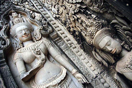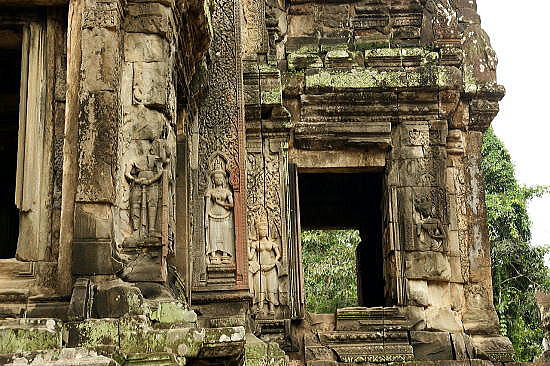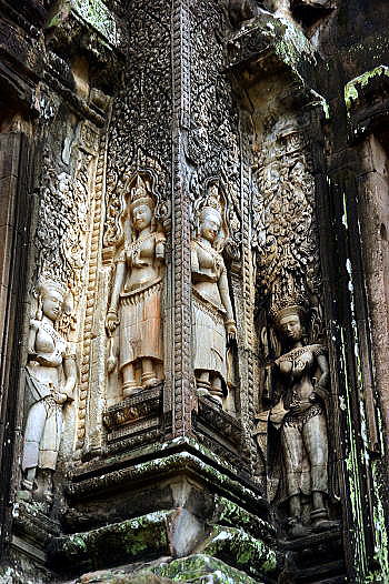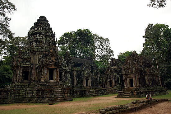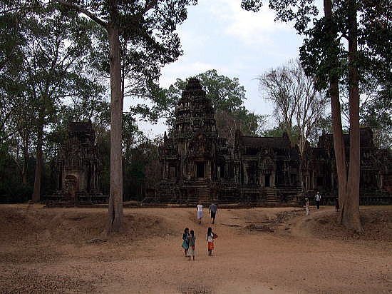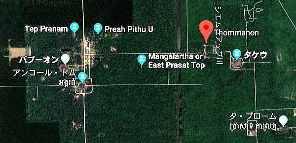 | アンコール遺跡全体目次 <中心部周辺の寺院・遺跡> プノン・バケン タ・プローム・ケル プラサット・バイ バクセイ・チャムクロン トマノン1 トマノン2 チャウ・サイ・テヴォーダ ◆トマノン1(Thommanon) トマノン(Thommanon)は、カンボジアのアンコール遺跡において、チャウ・サイ・テヴォーダと1対となるスーリヤヴァルマン2世(在位1113-1150年)の統治中に建てられたヒンドゥー教寺院のうちの1つです。 トマノンの場所は、下図にあるうように、アンコール・トムの「勝利の門」を出てすぐのところにあります。 ![]() アンコール遺跡・寺院地図 ![]() トマノン寺院の位置 出典:グーグルマップ ![]() カンボジア、シェムリアップのアンコール・トマノン寺院の一連の個別の構造物。このヒンズー教の寺院はクメール帝国の王スーリヤバルマン2世によって12世紀初頭に完成しました。スーリヤバルマン2世はアンコール・ワットの建築者であり、12世紀に30年以上にわたって彼の王国を支配しました。 Source:Wikimedia Commons この小さいが洗練された寺院は、アンコール・トムの勝利の門からおよそ500メートル東、チャウ・サイ・テヴォーダのすぐ北に位置しています。 この寺院は、国際連合教育科学文化機関(ユネスコ、UNESCO)により、アンコール遺跡 (Angkor) の名で1992年に登録されたユネスコ世界遺産の一部です。寺院はシヴァおよびヴィシュヌに捧げられています。 ![]() 勝利の門より通じる経路からの景観 Source:Wikimedia Commons 歴史 トマノンに見られるデヴァターの彫刻を研究する学者らは、トマノンは、アンコール・ワットの造営が始まった頃に構築されたと判断しています。しかし、建造された厳密な正確な年月についてはいくつかの相違があります。 一部において、デヴァターとして知られている女神の特徴のある彫刻は、それらがジャヤーヴァルマン6世(1080-1113年)の統治中である11世紀末に建設されたことを示唆すると考えられています。 しかしながら、より多くの合意として、特にそれが1113-1150年にかけてのアンコール・ワットやベンメリアの頃の時代にスーリヤヴァルマン2世によって建てられたという学術研究がすでに知られています。 ヴィシュヌ派の崇拝は、カンボジアにおいてジャヤーヴァルマン2世とその息子ジャヤーヴァルマン3世により採択された。これら2人の支配者のもと、シヴァ派の崇拝は、トマノン、ベンメリア、チャウ・サイ・テヴォーダ、バンテアイ・サムレ、アンコール・ワットなどの寺院においてヴィシュヌ崇拝に包含されました。 トマノンは、タ・ケウに向かう道上の勝利の門より500メートル東、チャウ・サイ・テヴォーダのちょうど反対側に位置しています。1960年代に、寺院はフランス極東学院(仏: Ecole francaise d'Extreme-Orient、EFEO)により大規模な修復を受けました。フランス人考古学者ベルナール=フィリップ・グロリエが寺院を修復し、コンクリートの天井を加えました。 構造 ![]() 左: 扉の彫刻。右: 寺院扉口のまぐさ(リンテル)の彫刻。 Source:Wikimedia Commons トマノンは、高さ約2メートルの基壇上に1つの塔と拝殿をもつ寺院であり、南側に1つの経蔵、東と西に塔門、東塔門より続く参道の東には小型の十字テラスがあります。 東向きの中央の聖所が、円錐形の冠を頂く祠堂すなわち塔となります。東からの通路は、塔門(ゴープラ、gopura)を経て、中央祠堂に至る前に、拝殿(マンダパ、mandapa、または控えの間)が接続しています。 寺院を囲む複合壁は、東と西にある入場門のみを残し、一部のラテライトの痕跡以外すべてが消失しています。中央の塔が主祠堂の遺構です。トマノンとチャウ・サイ・テヴォーダの両寺院は、大きな門をもつ1つの大きな複合構造物のもとで中央の塔に結びついていたとも推測されます。主祠堂の南東側に分離し独立した建物は経蔵です。 左: 扉の彫刻。右: 寺院扉口のまぐさ(リンテル)の彫刻。 左: 扉の彫刻。右: 寺院扉口のまぐさ(リンテル)の彫刻。 左: 扉の彫刻。右: 寺院扉口のまぐさ(リンテル)の彫刻。 寺院の彫刻は非常によく保存され、古い砂岩が周囲の密林にはっきりとした対照をもたらしています。その塔の建築様式は、アンコール・ワットおよび寺院に近接するチャウ・サイ・テヴォーダとも類似しています。 寺院は、近くにある修復を受けたチャウ・サイ・テヴォーダと両寺院の設計において似ていますが、それよりかなり良い状態で保存されています。トマノンがより良い保存状態である理由は、その上部構造が石で囲まれた木の梁を持たないことに起因しています。 つまり、この寺院の彫刻の資材としての砂岩の採用が、ほぼ木製であったその周辺にある他の寺院に対して、その構造上の設計において進歩していたのです。すべての扉口には彫刻されたペディメント(破風)があります。 ![]() 中央祠堂と拝殿(マンダパ)。 Source:Wikimedia Commons デヴァター ![]() 左: 壁角に描写されたサンポット衣装の型が異なるデヴァター。 Source:Wikimedia Commons ![]() 右: デヴァター(女神)