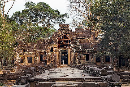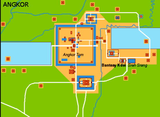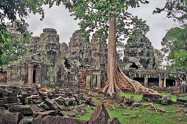 | アンコール遺跡全体目次 <東部の寺院・遺跡1> スピアン・トマ タ・ケウ1 タ・ケウ2 バンテアイ・サムレ1 バンテアイ・サムレ2 タ・プローム1 タ・プローム2 スラ・スラン バンテアイ・クデイ1 バンテアイ・クデイ2 バンテアイ・クデイ3 ◆バンテアイ・クデイ1(Prasat Banteay Kdei) バンテアイ・クデイは、多くの アンコール寺院の1つであり、400平方キロメートル(150平方マイル)のアンコール遺跡公園内に位置します。 クメール王朝時代におけるアンコールの古代都市はトンレサップからクーレン丘陵にかけて広がる1,000平方キロメートルの広大な領域にわたっています。 ![]() アンコール遺跡・寺院地図 この寺院はタ・プロームの東の塔門(ゴープラ、gopura)より600メートルとなる経路沿いに通じています。この経路はバンテアイ・クデイの西塔門入口につながっています。寺院はアンコール・トムの東3キロメートルにあります。 ![]() 出典:グーグルマップ やはり、バンテアイ・クデイも敷地は正方形であり、その周りは濠となっています。 ![]() バンテアイ・クデイ(Prasat Banteay Kdei) 出典:グーグルマップ衛星写真 ![]() カンボジア、アンコール、バンテアイ・クデイ寺院 Source:Wikimedia Commons バンテアイ・クデイ(Prasat Banteay Kdei)は、カンボジアのアンコール遺跡において、「チャンバ族の砦」("Citadel of Chambers")、または「僧房の砦」( "Citadel of Monks' cells")として知られる仏教寺院です。 この寺院はタ・プロームの南東、アンコール・トムの東に位置します。12世紀半ばから13世紀初頭のジャヤーヴァルマン7世(在位1181年-1218年頃[8]または1219年ないし1220年頃、死後 "Maha paramasangata pada" と称されました)の統治中に築かれたものです。 バイヨン様式で、構成はタ・プロームやプリヤ・カーンに似ていますが、複雑ではなく、より小さい寺院です。その構造物は2重の周壁に囲まれており、そして塔門から2重の中央回廊を構成し、東面前方には前柱殿があります。 この仏教寺院複合体は、これまで不完全な建設およびその建築に質の悪い砂岩が使われていたために荒廃し、現在修復を受けています。バンテアイ・クデイは1960年代まで何世紀にもわたってさまざまな間隔で僧侶により占有されていました。 ![]() バンテアイ・クデイ(Prasat Banteay Kdei) Source:Wikimedia Commons ![]() バンテアイ・クデイ(Prasat Banteay Kdei) Source:Wikimedia Commons ![]() バンテアイ・クデイ(Banteay Kdei)は、カンボジアのアンコールにある寺院です。それはタプロームの南東とアンコールトムの東に位置しています。 ジャヤバルマン7世の治世中の12世紀後半から13世紀初頭に建てられたこの寺院は、バイヨン様式の仏教寺院で、タ・プロームやプレア・カーン(Preah Khan)と似ていますが、それほど複雑ではありません。その構造は2つの連続した囲い壁の中に含まれており、そこから塔が出現する2つの同心円のギャラリーから成り、その前には回廊があります。この修道院の複合体は現在、不完全な構造と質 の悪い砂岩が原因で老朽化しています。バンテアイ・クデイは何世紀にもわたって様々な間隔で僧侶によって占領されてきましたが、碑文の石は発見されたことがないので、神殿が誰に捧げられているのかは不明です。 Source:Wikimedia Commons 地理 ![]() バンテアイ・クデイ(Prasat Banteay Kdei)の位置 Source:Wikimedia Commons 歴史 クメール王朝は802年から1431年の長きにわたっており、当初12世紀末まではヒンドゥー教徒の敬虔な信仰のもと、その後は仏教徒の厚い信奉のもとにありました。その時代に壮大な寺院が建造されるようになり、1191年まではスーリヤヴァルマン2世の統治中において、その後12-13世紀にはジャヤーヴァルマン7世のもとにおいて頂点に達しました。 バンテアイ・クデイを含め、多くの仏教寺院が12世紀半ばから13世紀初頭に構築されました。ジャヤーヴァルマン7世は多くの寺院を建造した功績が評価されましたが、彼はまた社会および他の職務を犠牲にした途方もない寺院の建築計画における散財が非難されています。 ジャヤーヴァルマン7世は聖観音菩薩を主に崇める仏教寺院を構築しましたこの寺院は、ジャヤーヴァルマン7世による同時期の近隣にあるタ・プロームやプリヤ・カーン寺院の様式と同様に構築されたが、規模は小さく、ラージェンドラヴァルマン2世(英語版)により建てられた10世紀の寺院の位置に、仏教僧院複合体として築かれました。いくつかの小さな碑文は、ジャヤーヴァルマン7世および王室建築家 Kavindrarimathana により本寺院が建造されたことを証明しています。 ジャヤーヴァルマン7世は、アンコールに攻め入り徹底的に破壊し支配したチャム族を倒した後、55歳で政権を握りました。彼の「驚異的な活動」は、その廃墟からカンボジアの復興をもたらしました。 ジャヤーヴァルマン7世はまず第一にアンコール・トムにおいて首都を再建し、「偉大な建造者」と呼ばれました。彼は多くの寺院を建設する役目を果たし、それはバンテアイ・クデイとは別に、バイヨン、プリ
