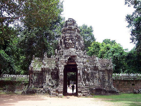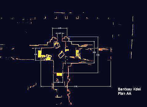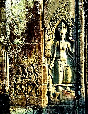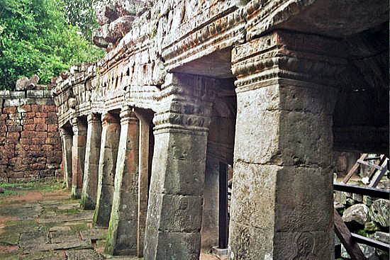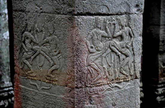 | アンコール遺跡全体目次 <東部の寺院・遺跡1> スピアン・トマ タ・ケウ1 タ・ケウ2 バンテアイ・サムレ1 バンテアイ・サムレ2 タ・プローム1 タ・プローム2 スラ・スラン バンテアイ・クデイ1 バンテアイ・クデイ2 バンテアイ・クデイ3 ◆バンテアイ・クデイ2(Prasat Banteay Kdei) ラテライト石で造られた東西700メートル、南北500メートルの大きな複合周壁内に3つの周壁があり、寺院の祠堂部分は、65×50メートルの敷地を巡る回廊で囲まれています。入口は東側の塔門(外周壁東塔門)であり、十字形で観音菩薩(ローケーシュヴァラ、Lokesvara)像が装飾されています。寺院は、バイヨンおよびアンコール・ワットの建築様式における彫刻の宝庫です。 外周壁 ![]() 仏面塔(東塔門) Source:Wikimedia Commons 4辺の同心の壁を持つ外周壁は、タ・プローム寺院と同じく4つの塔門を持っており、すべてある程度の保存状態内にあります。塔門には観音菩薩の四面があり(その微笑んでいる顔は王ジャヤーヴァルマンであるともいわれ、バイヨン寺院に見られるものと同様とされています)、4隅のガルーダ像の上に配置されています。 東に面した塔門は、特にその4隅のガルーダ像がよく保存されています。この周壁の入口の西より200メートルで濠に至り、そこはライオン(シンハ)の像やガルーダの乗ったナーガの欄干で装飾された広いテラスがあります。その濠自体が320×300メートルとなる境内の第3周壁であり、同様にラテライトの壁で囲まれています。この門の入口内にある仏像は、後に安置されたものです。 第3周壁 ![]() 前柱殿のアプサラスの彫刻 Source:Wikimedia Commons 第3周壁は、十字形(英語版)に設計された塔門(第3周壁楼門)を持ちます。そこにある柱はアーチ型の天井を支えています。この囲いには3つの通路があり、両側の2つはラテライトの壁で独立しています。 ここにある壁龕(へきがん)は小立像を持ち、また単体ないし1対の踊りのポーズをとるアプサラス(アプサラ)やデヴァターがあります。仏像は、この周壁内の中庭で、破壊者によって壊された。東楼門からナーガの欄干を持つ敷石された通路があり、2つの周壁を備えた祠堂へとつながっています。 これらの周壁回廊の入口となる東端から、前柱殿(「踊り子殿」、"Hall of Dancers")は屋根のなくなった中庭としてあり、その柱はアプサラスの繊細な彫刻を持っています。 第2周壁 ![]() アプサラス(左)やデヴァタ(右)のレリーフ Source:Wikimedia Commons 祠堂の一部である第2周壁は、58×50メートルとなる。塔門はその東端にあり、また西にもそれに次ぐ塔門があります。出入口は南・北の端にもあります。塔門は、1つの外壁と2重の列柱とともに回廊のように築かれ、中庭へと通じています。 この中庭にはアプサラス像が装飾されており、中央の間にある仏像は破壊者により損傷しています。バイヨン様式の建築の特徴として備えたものには、「覆いの下げられた連子(れんじ)のある偽窓や、三角に燃え立つ小さな盤に頭飾りのあるデヴァター」があります。砂岩とラテライトで築かれたアーチ型の屋根は、柱廊の数か所で崩壊しています。内周壁内には、その北と南に経蔵があり、さらに中央祠堂を包含します。 内周壁 祠堂の内周壁は36×30メートルの配置計画に基づき構築されています。この周壁は、小さな塔門に隣接した4隅に塔を持ちます。主軸沿いに通る回廊が、これらの塔を主祠堂に連結させています。北東と南東にある塔は、仏坐像の見られる第2回廊とつながります。 2.75メートル四方の回廊となる主祠堂部分は、神々の彫像の痕跡をいくつか持ちます。一方、この回廊のすべてがバイヨン様式で構築されていないことから、それ以前の時代のものであることが推測されます。また木製の天井の残骸もここで見られています。中央祠堂への入口には、アプサラスに囲まれたドヴァラパーラ(門衛神)が側面にあります。 ![]() スラ・スランは、儀式のための王の沐浴池とされる Source:Wikimedia Commons スラ・スラン 詳細は「スラ・スラン」を参照 バンテアイ・クデイの東にあるスラ・スランは、「王の水浴池」または「沐浴池」といわれています。10世紀のラージェンドラヴァルマン2世の治世中に掘られたもので、大きさは東西700メートル、南北300メートルとなります。 太陽と向き合う池のほとりには、砂岩の外縁を持つラテライトの階段が配置され、ジャヤーヴァルマン7世によって美化されています。スラ・スランは、大きな木々に囲まれ、一年中、青緑色の水をたたえています。 水辺への階段には、装飾されたナーガの欄干に2体のライオン(シンハ)の石像が側面に並んでいます。この池は、王や彼の妻が使用するために備えられたとされています。かつて池の中央にあった島に見られた石の基盤には、王が瞑想した木造の寺院がありました。池の水は現在、地域の農民による稲作に使われています。 建築上の特徴 ![]() 厚い石の屋根を支える大きな柱 Source:Wikimedia Commons バイヨン様式として発展したいくつか