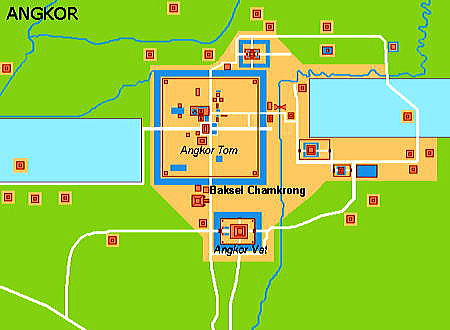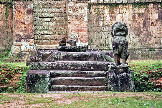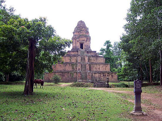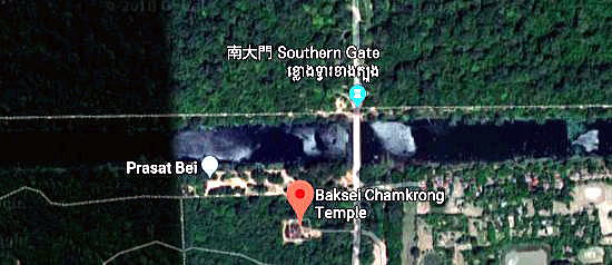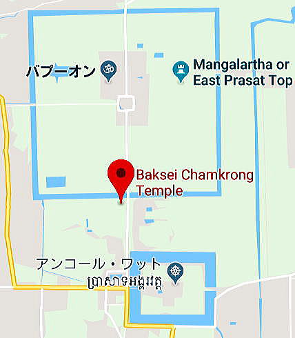 | アンコール遺跡全体目次 <中心部周辺の寺院・遺跡> プノン・バケン タ・プローム・ケル プラサット・バイ バクセイ・チャムクロン トマノン1 トマノン2 チャウ・サイ・テヴォーダ ◆バクセイ・チャムクロン(Baksei Chamkrong) バクセイ・チャムクロン(Baksei Chamkrong)は、カンボジアのシェムリアップに近いアンコール遺跡群の小さなヒンドゥー教寺院 (Hindu temple) です。寺院はシヴァ神に捧げられ、シヴァの金色の像を保持していました。バクセイ・チャムクロンは南大門からアンコール・トムに入るとき左側に見られます。 バクセイ・チャムクロンは10世紀、息子である王ハルシャヴァルマン1世(在位910-944年)により、父ヤショヴァルマン1世に捧げられました。寺院はラージェンドラヴァルマン2世(在位944-968年)によって完成しました。 ![]() アンコール遺跡・寺院地図 以下のグーグルマップは、バクセイ・チャムクロン(Baksei Chamkrong)の位置を示しています。位置はアンコール・トムの南大門のすぐ南にあります。 ![]() 出典:グーグルマップ ![]() 出典:グーグルマップ 以下バクセイ・チャムクロン(Baksei Chamkrong)の祠堂の写真です。 ![]() バクセイ・チャムクロン(Baksei Chamkrong) Source:Wikimedia Commons 名前 バクセイ・チャムクロンという名は、「翼下で護る鳥」を意味し、王が攻囲されたアンコールから逃れようとしていた時、巨大な鳥が舞い降りて、その翼の下で王を護ったという伝説に由来しています。 構成 ![]() 東側より Source:Wikimedia Commons この寺院は、煉瓦やラテライトなどの耐久性のある素材と砂岩の装飾により建築された最初の寺院の1つです。当初は煉瓦の周壁がピラミッド型寺院を囲んでいましたが、東側の塔門(ゴープラ、gopura)もわずかに残る痕跡以外ほとんど完全に消滅しています。 ![]() バクセイ・チャムクロンの位置 Source:Wikimedia Commons ピラミッド型寺院の4段のラテライトの基壇は直径27メートル、頂上部では15メートル、高さは12メートル。 4本の階段が基壇の頂上部まで伸びます。煉瓦の中央祠堂が8メートル四方の砂岩の基盤に建ちます。東の扉が開き、ほかの3面には通常の偽扉があります。 ![]() 平面図 Source:Wikimedia Commons ![]() 偽扉 Source:Wikimedia Commons 寺院の外面の化粧漆喰(スタッコ)は大半が失われています。中心の砂岩のまぐさ(リンテル)は、インドラが3つの頭の象アイラーヴァタの上に立っている細かな彫刻で装飾されています。 花輪模様がインドラの両側から、遺跡に一般的な様式で広がっています。碑文が小さい扉口の両側にあり、ジャヤーヴァルマン2世からのクメール王朝初期の王たちや、同じく国家の祖先である隠者カンブー (Kambu) など、より以前の伝説的な王たちへの奉献と賛美が記されています。 ![]() まぐさ(リンテル)の装飾。アイラーヴァタの上にインドラが、両端にはガネーシャが彫られる。 Source:Wikimedia Commons 以下はバクセイ・チャムクロン寺院の写真ギャラリーです。 ![]() Angkor temples, north of Siam Reap, Cambodia Source:Wikimedia Commons ![]() Baksei Chamkrong. Angkor Cambodia Source:Wikimedia Commons ![]() Temple entrance Source:Wikimedia Commons トマノン1につづく アンコール遺跡全体目次 |