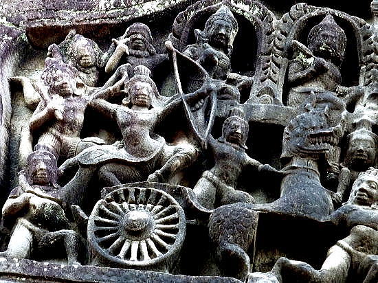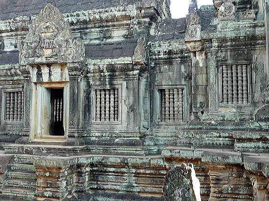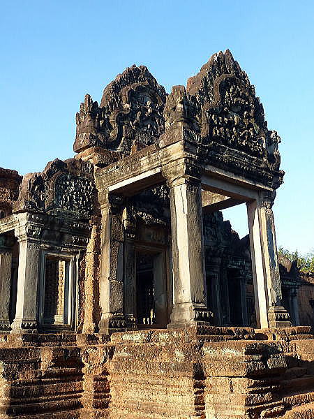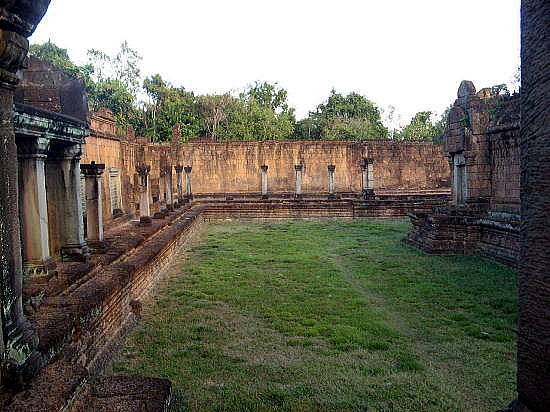 | アンコール遺跡全体目次 <東部の寺院・遺跡1> スピアン・トマ タ・ケウ1 タ・ケウ2 バンテアイ・サムレ1 バンテアイ・サムレ2 タ・プローム1 タ・プローム2 スラ・スラン バンテアイ・クデイ1 バンテアイ・クデイ2 バンテアイ・クデイ3 ◆バンテアイ・サムレ(Banteay Samre) バンテアイ・サムレは「サムレ族の砦」という意味を持っています。バンテアイ・サムレはアンコール・トムのバイヨン形式のつくりで回廊に囲まれた中に中央祠堂が建っています。そしてその回廊の周りをテラスが取り囲んでいます。 バンテアイ・サムレは中央祠堂には拝殿がついており、その拝殿は東塔門と近接して配置されています。 東西の塔門は分離して造られており、周壁と中央祠堂とを回廊で連結する造営がなされています。 第一周壁、第二周壁も、それぞれが東西南北の4つの塔門が配されており、 第二周壁の内部には西向きに2棟の経蔵があります。 同じ時期に造られたチャウ・サイ・テボーダやトマノン遺跡での祠堂と拝殿の連結手法を受け継いでいる と言われています。 このバイヨンの造営のヒントにもなったバンテアイ・サムレの動線と回廊のテラスを歩けば伽藍内部を一周できるという考え方は アンコール・ワットがつくられた直後に創建されたこの寺院であり、 バイヨンとの違いを見るうえのひとつのポイントなります。 ![]() アンコール遺跡・寺院地図 ![]() バンテアイ・サムレの位置 出典:グーグルマップ バンテアイ・サムレもタケウ同様、敷地は完全な正方形であり、その中心に祠堂があります。 ![]() バンテアイ・サムレの位置 出典:グーグルマップ ![]() 寺院の中央塔 Source:Wikimedia Commons ![]() バンテアイ・サムレへの入り口 Source:Wikimedia Commons ![]() 009:バンテアイ・サムレで撮影されたバンテアイ・サムレ寺院の戦争の 場面を描いた壁画 Source:Wikimedia Commons バンテアイ・サムレ(Banteay Samre)は、カンボジアのアンコール遺跡群における寺院遺跡の1つであり、東バライの東側に位置します。12世紀中頃にスーリヤヴァルマン2世(在位1113-1150年)の統治時代に造られたアンコール・ワット様式のヒンドゥー教寺院であり、小アンコール・ワットともいわれています。 高さ6メートルの外周壁に囲まれたバンテアイ・サムレは、インドシナ半島の古代民族サムレ (Samre) にちなんで名づけられ、「サムレ(入れ墨)族の砦」の意をもっています。寺院はバンテアイ・スレイと同じ材料を用いています。 バンテアイ・サムレは1936-1944年にフランスのモーリス・グレーズにより修復されました。 構成 ![]() バンテアイ・サムレの窓 Source:Wikimedia Commons ![]() ラテライトの外周壁 Source:Wikimedia Commons ラテライトで造られた周壁がほぼ正方形に囲んでおり、外・内周壁の東西南北それぞれに塔門(ゴープラ、gopura)を持っています。外周壁は83×77メートルであり、通常、ラテライトのテラスから続く東門より入場します。 内周壁(回廊)は44×38メートルです。内周壁には回廊へと改造された痕跡が認められています。 二重の周壁には連子窓(れんじまど)が見られ、円錐状の塔をもつ中央祠堂と、東側の基壇上に南・北となる2棟の経蔵などを備えています。 寺院の東西に参道があり、ラテライトの上に砂岩を敷いた東参道は延長200メートル、境界石が両端に認められる西参道は350メートルにおよび東バライの東端まで続きます。 バンテアイ・サムレ2につづく アンコール遺跡全体目次 |