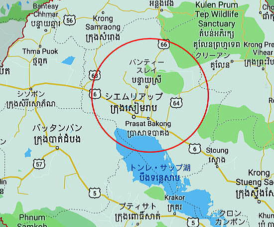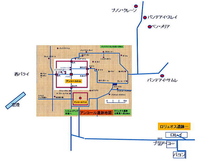 | アンコール遺跡全体目次 東南アジア巨大石造遺跡に魅せられて シエムリアップに行く1 シエムリアップに行く2 視察・見学の方法と注意 遺跡・寺院の概要・場所 <参考> カンボジア基礎知識 シェムリアップ基礎知識 博物館 クメール王朝について 創建順による遺跡・寺院 アンコール関連用語解説 クメール建築様式 アプサラとデヴァタ カンボジアの伝統工芸 以下にアンコール遺跡の概要と構成を紹介しておきます。 ◆アンコール遺跡の概要 アンコール遺跡は、以下の地図の赤〇内がカンボジアの北西部、トンレサップ湖北岸のシェムリアップの北側に位置するクメール王朝時代の遺跡群です。 ![]() 出典:グーグルマップ 1992年ユネスコの世界危機遺産に登録され、遺跡を中心とし修復に努めてきましたが、第二段階として2004年世界文化遺産に登録され、今まで危機遺産だった遺跡エリア(ゾーン1)の周りを取り囲むように、ゾーン2エリアを設定し全体で「アンコール遺跡公園」と命名されました。 コアな遺跡エリアの周りには、アンコールの広大な400万ヘクタールに及ぶ地域に、112の村、13万の住民、森、水田、放牧地が広がり、村人の生活、自然環境の保護、景観の維持に取り組んでいます。 出典「アンコール世界遺産エリア・ツーリストマネジメントプラン」 アプサラ・ナショナル・オーソリティ2012年12月 アンコール遺跡群は現在のカンボジア王国の淵源となったクメール王朝の首都の跡です。 この土地には、9世紀頃から数々の王宮建設が開始されました。この遺跡に特に大きく関わったとされるのはスーリヤヴァルマン2世(1113-1145年)とジャヤーヴァルマン7世(1181-1218年)といわれています。 スーリヤヴァルマン2世は特にアンコール・ワットの建設を行い、その死後30年ほど後に王に就いたとされるジャヤーヴァルマン7世はアンコール・トムの大部分を築いたとされています。 しかし、ジャヤーヴァルマン7世が崩御した後のアンコールはアユタヤ朝の進入を度々受けその存在を侵され始め、その後ポニャー・ヤット王はついにアンコールを放棄するに至ったのです。 ◆アンコール遺跡の構成 アンコール遺跡に含まれる主な遺跡は以下の通りです。 膨大の遺跡がありますが、以下の地図に示した遺跡は、そのなかでも比較的著名なものであり、それ以外にも多数の遺跡があります。また下の地図から数10km離れている寺院、遺跡もあります。 ここではアンコール遺跡の構成では、遺跡・寺院等の詳細の前に、その概要をと場所(位置)を紹介します。なお、遺跡、寺院等の名称などは総合目次と同じにしてあります。また、以下の地図は個別具体の遺跡、寺院等の頁の冒頭にも掲載しています。 ![]() アンコール遺跡地図 ![]() アンコール遺跡広域地図 ![]() ロリュオス遺跡地図 <中心部の寺院> ・アンコール・トム : 12世紀末-13世紀初頭、ジャヤーヴァルマン7世建立、仏教(観音菩薩)。 *バイヨン(アンコール・トム内) : 12世紀末、ジャヤーヴァルマン7世建立、仏教(観音菩薩)。 *象のテラス(アンコール・トム内) : 12世紀末、ジャヤーヴァルマン7世建立、仏教(観音菩薩)。 *ライ王のテラス(アンコール・トム内) : 12世紀末、ジャヤーヴァルマン7世建立、仏教(観音菩薩)。 *ピミアナカス(アンコール・トム内) : 10世紀末-11世紀初頭、スーリヤヴァルマン1世建立、ヒンドゥー教。 *プラサット・スゥル・プラット : 12世紀末、ジャヤーヴァルマン7世建立、仏教。 *クリアン : 11世紀初頭、ジャヤーヴァルマン5世、スーリヤヴァルマン1世建立、ヒンドゥー教。 *バプーオン(アンコール・トム内) : 1060年頃、ウダヤーディティヤヴァルマン2世建立、ヒンドゥー教、15世紀以降仏教。 ・プリア・パリライ : 12世紀前半、仏教。 *プリア・ピトゥ : 12世紀前半、ヒンドゥー教(シヴァ)。 ・アンコール・ワット : 1113-1145年頃、スーリヤヴァルマン2世建立、ヒンドゥー教(ヴィシュヌ)。 *プノン・バケン(アンコール・ワットとトムの間) : 900年頃、ヤショヴァルマン1世建立、ヒンドゥー教(シヴァ)。 *プラサット・バイ : ヤショヴァルマン1世建立、ヒンドゥー教(シヴァ)。 *バクセイ・チャムクロン : 947年、ハルシャヴァルマン1世(910-944年)、ラージェンドラヴァルマン2世(944-968年)建立、ヒンドゥー教(シヴァ)。 *トマノン (アンコール・トムの北東): 12世紀前半、スーリヤヴァルマン2世建立、ヒンドゥー教。 *チャウ・サイ・テヴォーダ : 12世紀前半、スーリヤヴァルマン2世建立、ヒンドゥー教。 *スピアン・トマ : 11世紀初頭 <東部の寺院> *プレ・ループ(アンコール・トムの東): 961年、ラージェンドラヴァルマン2世建立、ヒンドゥー教(シヴァ)。 *タ・ケウ(アンコール・トムの東) : 1000年頃、ジャヤーヴァルマン5世建立、ヒンドゥー教(シヴァ)。 *バンテアイ・サムレ : 12世紀中頃、スーリヤヴァルマン2世建立、ヒンドゥー教(ヴィシュヌ)。 *タ・プローム (アンコール・トムの東): 1186年、ジャヤーヴァルマン7世建立、仏教(観音菩薩)。 *スラ・スラン : 12世紀末、ジャヤ