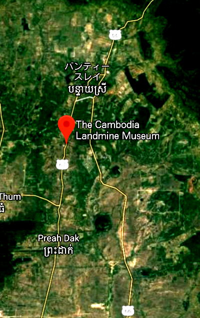 シェムリアアップにも、ワット・トメイ寺院として、「キリング・フィールド(The Killing Fields)」がアンコール・ワットの南西にあります。 ![]() ワット・トメイ寺院(キリング・フィールド) (トリップアドバイザー提供) ![]() ワット・トメイ寺院(キリング・フィールド) (トリップアドバイザー提供) ◆地雷博物館(Cambodia Landmine Museum) 火災事故でしばらく休館していたシェリムアップの地雷博物館が再オープンしています。 日本語ガイドもいてカンボジアの歴史についても詳しく説明してくれるとのことです。 場所は以下のグーグル地図にあるように、有名なバンスティー・スレイ寺院の手前(南側)にあります。 なお、「地雷博物館はシェムリアップの中心地から北に約25kmの場所にあります。トゥクトゥクで片道約45分。僕が泊まっていた宿でお願いしてみたところ、往復15ドルで行くことができました。」という情報もあります。https://yokohamanogin.com/aki-ra/ ![]() 出典:グーグルマップ ![]() 出典:グーグルマップ ![]() Source: Google Map, Street View, Monique Konning, ![]() Source: Google Map , Street View, Eugene Gorny ![]() Source: Source: Google Map , Street View, John Sheridan ![]() Source: Source: Google Map , Street View, banner bruce クメール王朝についてにつづく アンコール遺跡全体目次 |