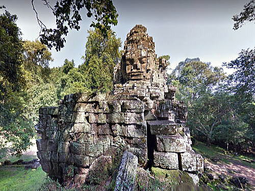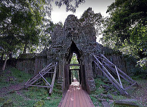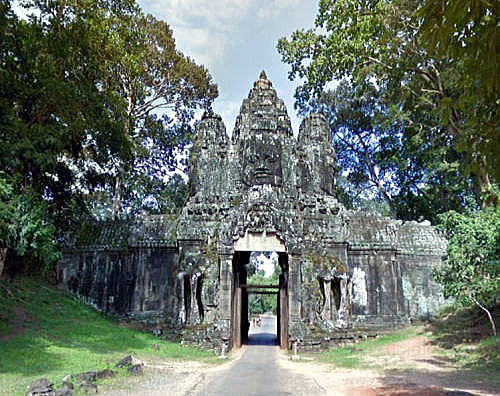 | アンコール遺跡全体目次 <アンコール・トム> アンコール・トム 南北門 東西門 王宮 ピミアナカス バイヨン1 バイヨン2 バイヨン3 バイヨン4 象のテラス1 象のテラス2 象のテラス3 ライ王のテラス1 ライ王のテラス2 ライ王のテラス3 プラサット・スゥル・プラット クリアン1 クリアン2 バプーオン1 バプーオン2 ◆アンコール・トムの東西門 <東門> 勝利の門 ![]() 出典:グーグルマップ ![]() 出典:グーグルマップ ![]() 出典:グーグルマップ ![]() 出典:グーグルマップ アンコール・トムの東門は二つあり、死者の門と勝利の門と呼ばれています。戦いに勝利した戦士たちが凱旋した時に通ったのが勝利の門、と呼ばれています。 場所的には王宮の真正面にあたります。ちなみに死者の門はバイヨンの真正面にあたっていますが、死者の門の方へは未舗装道路しかありません。 勝利の門の上には、アンコール・トムの他の門と同様、東西南北の四面に観世音菩薩の大きな顔の彫刻があります。 ![]() 東門、勝利の門 車の中から撮影 撮影:池田こみち Nikon Coolpix S9900 ![]() 東門、勝利の門 車の中から撮影 撮影:池田こみち Nikon Coolpix S9900 <東門> 死者の門 東西南北に位置する四つのアンコール・トムの門へ向かい中央のバイヨンからまっすぐ道が延びており、それらの城門は西大門、南大門、北大門と方位を付されて呼ばれていますが、東の城門は、戦いに倒れたクメール兵の魂がこの参道を通ってバイヨンに戻ると考えられていたので「死者の門」と言う名前がついています。 ![]() 出典:グーグルマップ ![]() 出典:グーグルマップ <西門>西大門 ![]() 出典:グーグルマップ ![]() 出典:グーグルマップ 王宮につづく バイヨン |