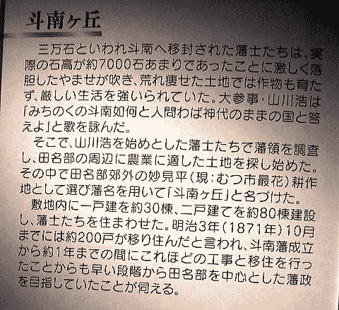@八重の桜から斗南藩へ A斗南ヶ丘の夢 B旧斗南藩墳墓の地 C円通寺と徳玄 D斗南藩士上陸の地 ![]() 5月17日昼近く到着したむつ市では、斗南藩に関わる史跡の大部分を訪問することができた。 ![]() 斗南藩史分布図(むつ市) 出典:むつ市 ◆斗南藩史跡地「斗南ヶ丘」 むつ市で最初に訪れたのは、斗南藩史跡地である。ここに斗南藩の人々の住宅をつくり「斗南ヶ丘」という名の市街地としたものの、あまりにも過酷な風雪や野火にあうなどにより、藩士たちのこの地にかけた夢ははかなくも消え去ったと「斗南ヶ丘市街地跡」に書かれています。 ![]() 斗南藩史跡地「斗南ヶ丘」にて(むつ市) 撮影:青山貞一 Nikon Coolpix S8 2014-5-17 ![]() 斗南ヶ丘市街地跡の解説板 撮影:池田こみち Nikon Coolpix S6400 2014-5-17 ![]() 斗南藩史跡地「斗南ヶ丘」にて(むつ市) 撮影:青山貞一 Nikon Coolpix S8 2014-5-17 以下は獅子の時代と斗南が丘のむつ市の解説板。 ![]() 獅子の時代と斗南が丘解説板 撮影:池田こみち Nikon Coolpix S6400 2014-5-17