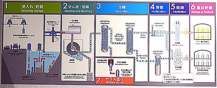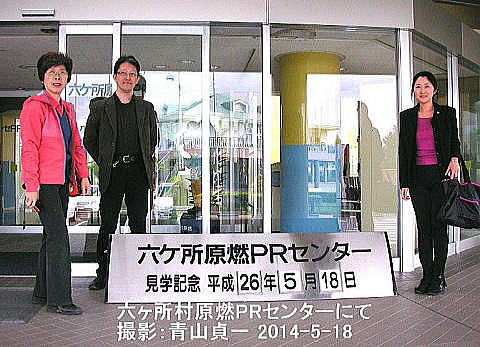 文責・青山貞一 六カ所村には、イギリス、フランスなど世界に数カ所しかない核廃棄物再処理工場がある。六カ所村の超広大な土地に日本原燃が所有する核燃料の再処理工場が散在している。 1993年から約2兆1,900億円の費用をかけ、青森県上北郡六ヶ所村弥栄平地区に「濃縮」、「埋蔵」、「再処理」、「廃棄物管理」、「MOX燃料加工」の各事業とそのための施設建設が進められており、現在試運転中である。核廃棄物サイクル処理は、今回の現地調査の一つの目玉である。 2014年5月18日午後3時六カ所村にある日本原燃PRセンターを訪問した。この訪問はあからじめ原燃PRセンター側に所定の説明付きの訪問申し込みを行った上で実現したものである。 ![]() 六カ所村原燃施設PRセンター入り口にて 撮影:青山貞一 Nikon Coolpix S8 2014-5-18 ![]() 六カ所村役場前にて 撮影:斎藤真実 ![]() 六カ所村原燃施設PRセンターにて 撮影:青山貞一 Nikon Coolpix S8 2014-5-18 以下は六カ所村の原燃PRセンターにおける展示(物)をもとに、六カ所村にある日本原燃の核廃棄物処理の流れの全体概要の説明である。 ![]() 出典:六ヶ所村日本原燃 原子力発電所で使い終わったウラン燃料の中には、燃え残りのウランと新しく出来たプルトニウムがある。これらを再びMOX燃料(Mixed Oxied Fuel)の原料として使えるように化学的な処理をするのが再処理工場である。つまり、再処理工場はウラン燃料のリサイクル工場である。 出典:六ヶ所村日本原燃