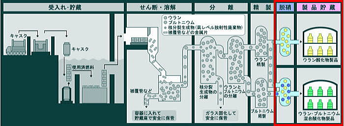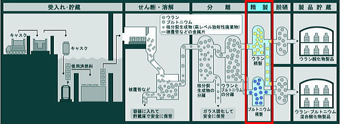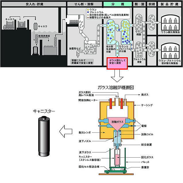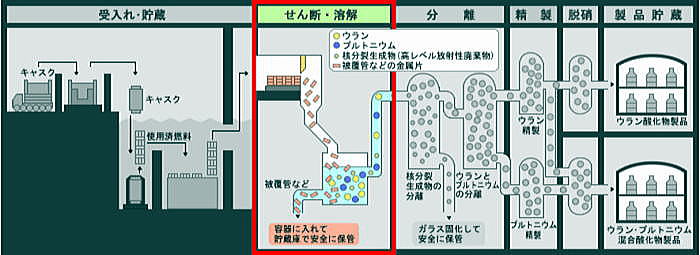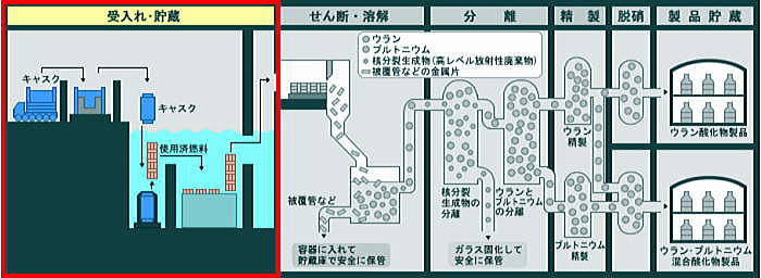 ![]() 出典:六ヶ所村日本原燃 原子力発電所から運ばれてきた使用済燃料は、使用済燃料輸送容器(キャスク)から取り出され、3基の燃料貯蔵プール(BWR専用、PWR専用、BWR/PWR共用)で4年以上冷却・貯蔵される。 冷却・貯蔵により放射能の量は数百分の1に減衰する。 冷却期間を終えた使用済燃料は、次のせん断工程に移送される。 ![]() 出典:六ヶ所村日本原燃 せん断・溶解工程では、せん断機で使用済燃料を細かく切断した後、硝酸を入れた溶解槽で燃料部分を溶かし、燃料部分と被覆管部分とを分別する。燃料を溶かした硝酸溶液は、清澄機で不溶解残渣(燃料せん断片を溶解槽で溶解した際に溶解せずに残る粒子状のもの)を除去した後、分離工程へ送る。 なお、溶け残った被覆管などの金属片は、固体廃棄物として処理する。 ![]() 出典:六ヶ所村日本原燃 分離工程では、パルスカラムという装置で、硝酸溶液を溶媒といわれる油性の溶液と接触させ、ウラン・プルトニウムと核分裂生成物を分離する。さらに、化学的性質の違いを利用してこのウランとプルトニウムも分離し、精製工程へ送る。 ![]() 出典:六ヶ所村日本原燃 精製工程では、パルスカラムやミキサセトラという装置を用い、ウラン溶液及びプルトニウム溶液中に含まれている微量の核分裂生成物をさらに取り除いて純度を高めた後、脱硝工程へ送る。 ![]() 出典:六ヶ所村日本原燃 脱硝工程では、脱硝塔を用いて、精製されたウラン溶液とウラン・プルトニウム混合溶液から硝酸を蒸発及び熱分解させて、ウラン酸化物粉末とウラン・プルトニウム混合酸化物粉末(MOX粉末)にする。それぞれの粉末は、燃料加工施設等に出荷されるまでの期間貯蔵する。 ![]() 出典:六ヶ所村日本原燃 再処理工程で生じる核分裂生成物を高レベル放射性廃棄物といいます。これらは、溶融炉の中で溶かしたガラスと混ぜ合わせ、キャニスターに入れ冷やし固める(ガラス固化体)。 つづく |