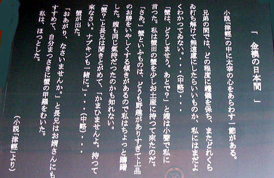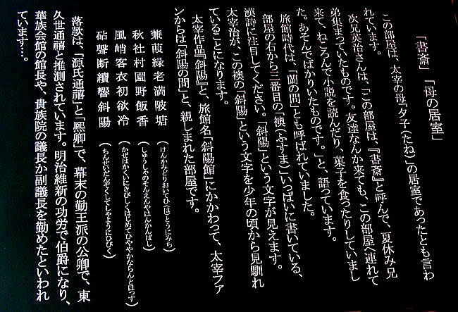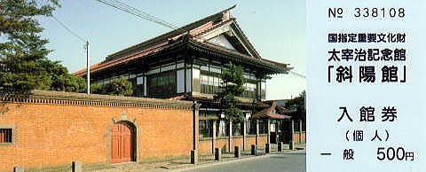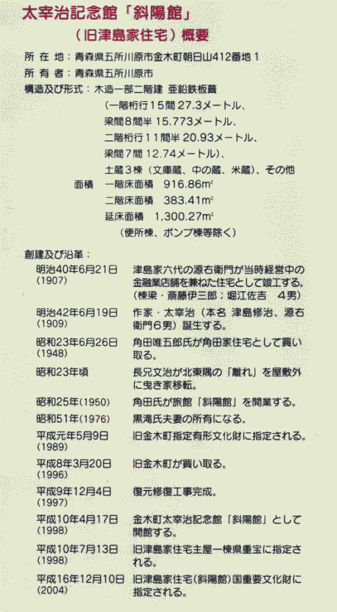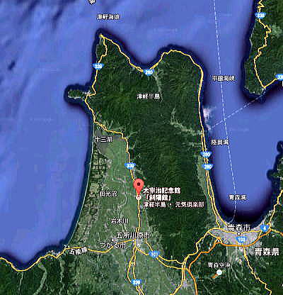 文責・青山貞一 2014年5月19日、五所川原市の風力発電ファームそして十三湖を視察した後、私達は、五所川原市にある太宰治記念館「斜陽館」に向かった。太宰治記念館は津軽半島に行くなら必ず寄ってみたかった場所である。 ![]() 五所川原市にある太宰治記念館「斜陽館」 出典:グーグルマップ ![]() 五所川原市にある太宰治記念館「斜陽館」 出典:グーグルマップ 太宰治記念館 「斜陽館」は、青森県五所川原市にある小説家太宰治の生家である。 現在は、五所川原市太宰治記念館「斜陽館」として、五所川原市立の施設となっている。また、「斜陽館」は近代和風住宅の代表例として2004年(平成16年)、国の重要文化財に指定されている。 入場は大人一人500円、5月〜10月は8:30〜18:00まで開館している。ちなみに11月〜4月は9:00〜17:00までである。 ![]() なお、記念館では研究室が撮影禁止となっていたが,その他は撮影が許可されていた。 ![]() ■太宰治記念館「斜陽館」 〒037-0202 青森県五所川原市金木町朝日山412ー1 撮影:青山貞一 Nikon Coolpix S8 2014-5-19 ![]() 五所川原市 太宰治「斜陽館」 撮影:青山貞一 Nikon Coolpix S8 2014-5-19 太宰 治は、本名を津島 修治と言い1936年(昭和11年)に最初の作品集『晩年』を刊行し、1948年(昭和23年)に山崎富栄と共に玉川上水で入水自殺を完遂させていることで知られる。 1909年(明治42年)6月19日 〜 1948年(昭和23年)6月13日)とわずか39歳の若さで他界している。 下は国指定重要文化財、太宰治記念館「斜陽館」の入り口。 ![]() 撮影:青山貞一 Nikon Coolpix S8 2014-5-19 ◆太宰治 出典:文章は主にWikipedia 太宰治は北津軽郡金木村(現在の五所川原市)に、県下有数の大地主である父津島源右衛門と母たねの六男として生まれた。父は木造村の豪農松木家からの婿養子で県会議員、衆議院議員、多額納税による貴族院議員等をつとめた地元の名士。津島家は「金木の殿様」とも呼ばれていた。父は仕事で多忙な日々を送り、母は病弱だったので、太宰自身は乳母らによって育てられた。 太宰はこの自分の家柄に死ぬまで悩み続けることになる。 ![]() 入館時にいただいた資料より 青森県公選知事一覧