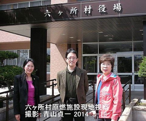 ![]() ユーラスヒッツ北野沢クリフ風力発電所の全景 出典:(株)ユーラスエナジー ◆六カ所村 私達は東通村をさらに南進した。途中、東京電力東通原子力発電所の建設工事現場やPR館さらに東北電力東通原子力発電所、また漁協などを視察しながら六カ所村に向かった。 ![]() 六ヶ所村近くにて 撮影:鷹取敦 六ヶ所村村には日本最大規模の風力発電ファームがあるはずだ。 ![]() 六ヶ所村役場前にて 撮影:青山貞一 Nikon Coolpix S8 2014-5-18 下は六カ所村にある汽水域にある湿地湿地(尾駮沼)。 ![]() 六ヶ所村の汽水域湿地(尾駮沼)にて 撮影:青山貞一 Nikon Coolpix S8 2014-5-18