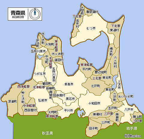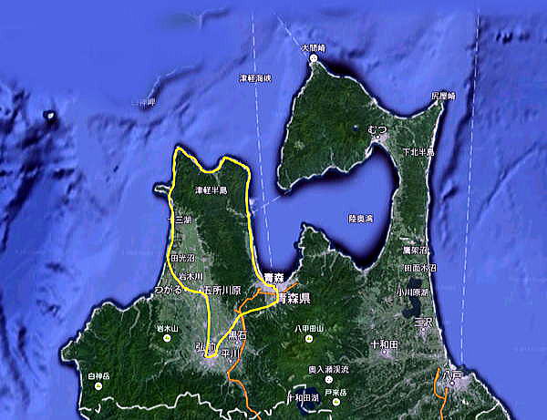 ![]() 下図は 青森県内にある主な風力発電ファームである。青森県内には約200基の風力発電施設があるとのことだが、今回の現地視察では、そのうち「おいらせ町」、「深浦町」以外の風力発電ファームのすべてを視察することが出来た。 ![]() 青森県内にある主な風力発電設備(基礎自治体別) 下の表は、字が小さく見づらいが、1997年5月から2012年12月までの間に青森県内に設置された風力発電設備の一覧である。 表 1997年5月から2012年12月までの間に青森県内に設置された風力発電設備の一覧 ![]() 出典:http://www.nedo.go.jp/library/fuuryoku/case/pref_02.html ◆2014年5月19日 翌日の5月19日(月)は、下図の黄線にあるように、青森駅前から津軽半島の東岸を北上し、津軽半島の突端、龍飛岬(外ヶ浜町)、その後、十三湖(五所川原市)、五所川原市、つがる市、弘前市を通り、夕方、青森空港に向かった。 ![]() 黄線が現地視察ルート 起点:青森市 終点:青森空港 ◆2014年5月19日 晴れ 外ヶ浜フェリー乗り場 □ 平館海岸灯台 ○ 平館道の駅 □ 高野岬灯台 □ 竜飛岬 ○ 吉田松陰記念碑など 竜飛岬展望レストラン ☆ 竜飛フインドファーム △ 竜飛岬新幹線基地 □ 竜飛岬漁港 ○ 太宰治記念碑 ☆ 五所川原風力発電 ☆ つがる風力発電 □ 小泊 □ 十三湖 ○ 太宰治記念館「斜陽館」 □ 弘前城・公園 □ 岩木山 この後、青森空港に向かい夕食後JAL最終便で帰京 ◆五所川原市 旧三厩村のウインドファームを視察した後、私達は津軽半島西岸を南下し、中泊町を経由して五所川原市に向かう。中泊町も飛び地が日本海側の外ヶ浜町の隣にある。
