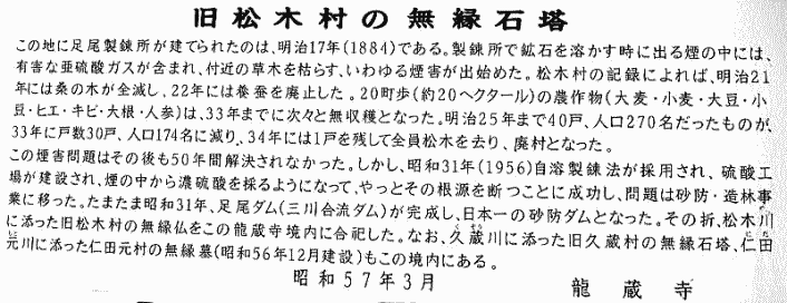 下の写真は、足尾銅山製錬所と県道250線の位置関係を示したものである。 ![]() 出典:グーグルマップ ストリートビュー さらに県道250号線を北上すると、道路に右側に龍蔵寺がある。 この龍蔵寺には、「本山地区」にあった墓石などが移設されているとともに、鉱毒で倒れていった渡抗夫と呼ばれる全国を渡り歩く抗夫たちの慰霊碑も設置されている。 ![]() 撮影:青山貞一 Nikon Coolpix S8 ![]() 撮影:青山貞一 Nikon Coolpix S8 ![]() 撮影:青山貞一 Nikon Coolpix S8