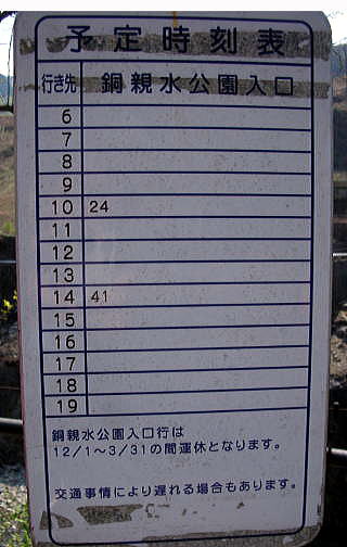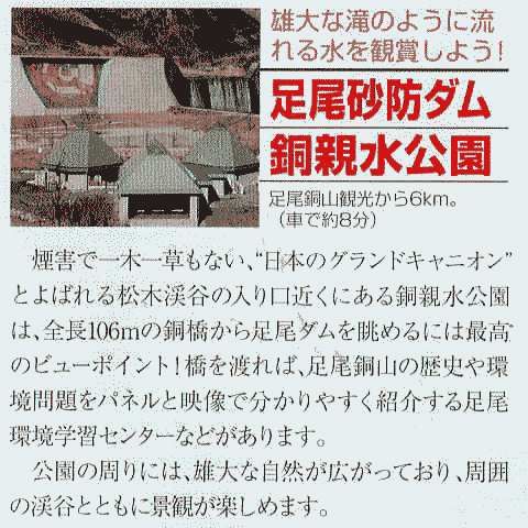 現地視察(1) 現地視察(2) 現地視察(3) 現地視察(4) 現地視察(5) 現地視察(6) 現地視察(7) 現地視察(8) 現地視察(9) 現地視察(10) 現地視察(11) 現地視察(12) 現地視察(13) 現地視察(14) 現地視察(15) ②本山から松木へ ![]() 出典:一般社団法人日光観光協会、足尾散策ガイドマップ をもとに青山が作製 古河鉱業、足尾製錬所がある「本山地区」からさらに県道250号線を北上すると「松木地区」に入る。松木地区には、日本のグランドキャニオンなどと呼ばれる松木川沿いの松木渓谷があるが、車は銅親水公園地域で進入禁止となる。 下の地図にある現在地は「銅親水公園」の位置を示している。現在位置あたりから北(上)側が「松木地区」である。 ![]() 撮影:青山貞一 Nikon Coolpix S8 ![]() 撮影:青山貞一 Nikon Coolpix S8 2014年5月7日の足尾銅山現地調査は日帰りであったこともあり、徒歩で松木渓谷に向かうのは断念した。そこで銅親水公園、足尾砂防ダムさらに足尾環境学習センターを視察するにとどめた。 ![]() 銅(あかがね)親水公園の入り口にて 出典:グーグルマップストリートビュー なお、足尾砂防堰堤(ダム)、銅(あかがね)親水公園、足尾環境学習センターに自家用車以外で行くためには、バスがあるが、下の時刻表にあるように、1日に2台しか行かないので注意が必要である。 ![]() 撮影:青山貞一 Nikon Coolpix S8 下は「足尾銅山観光」のパンフレットにある足尾砂防ダム、銅親水公園の紹介である。 ![]() まず最初に足尾砂防堰堤(砂防ダム)について国土交通省 関東地方整備局 渡良瀬川河川事務所の説明を示す。