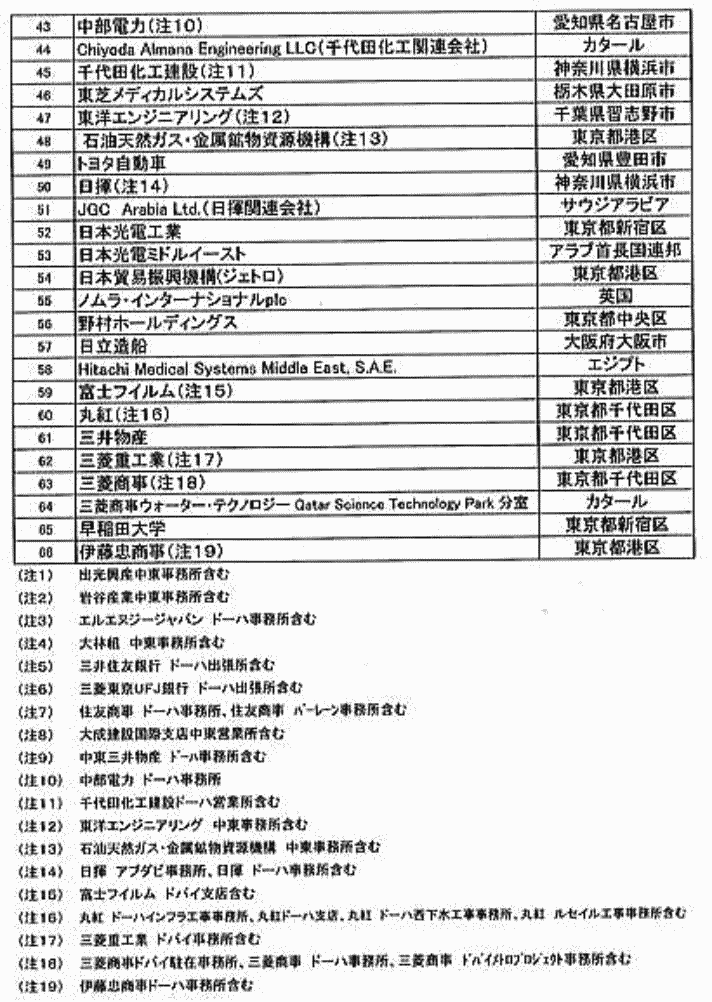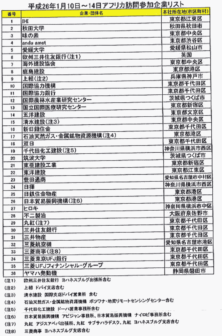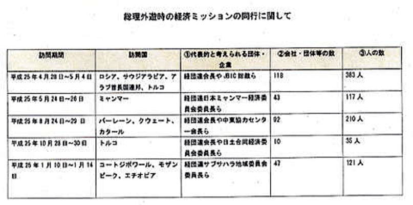 | 関連スレッド<国際|米国|アフリカ|中東|東南ア|中南米|ロシア|経済> 検索ワード:安倍首相 安倍政権 海外経済支援 海外経済援助 バラマキ 同行企業 原発売り込み 武器うりこみ 企業献金 リスト1 リスト2 リスト3 リスト4 リスト5 安倍首相の海外バラマキ・リストの第二次リストは、安倍総理が外遊するとき同行した企業・団体リストです。 以下に前衆議院議員の佐々木憲昭氏が調査され作成した安倍総理が外遊するとき同行した企業・団体リストを紹介します。 【14.02.11】安倍総理が外遊するとき同行した企業・団体リスト 安倍総理は、トップセールスに力を入れていますが、外遊の際に大企業の代表を同行させる場合が多いのが特徴です。以下の一覧表は、安倍首相の主な外遊時に同行した企業です。目的の中には原発輸出も含まれます。 安倍総理は、どのようにして同行者を選んでいるのでしょうか。1月29日の「日経新聞」にその手法の一端が紹介されています。 「今度の首相外遊に御社の社長に同行してもらいたい。誰にも相談せずに、返事は私のこの携帯にお願いしたい」と、「ある商社の渉外担当は、経済産業省幹部からこんな勧誘を受けた」と。 以前は経団連がメンバーや段取りを整える窓口だったが、いまの安倍政権では「首相補佐官の長谷川栄一(61)が企業のリストを練り、経産省が対象者を『一本釣り』で勧誘する」というのです。 自分の好みの人々だけでことを進めようという安倍総理のやり方が、この分野でも発揮されているようです。 ●安倍総理外遊時に同行した企業数・人数――総括表 ![]() ●2013年4月28日〜5月4日 ロシア、サウジアラビア、アラブ首長国連邦、トルコ 安倍総理が、ロシア、サウジアラビア、アラブ首長国連邦(UEA)、トルコを訪問した時(2013年4月28日から5月4日)に、同行した企業・団体のリストです。経団連会長やJBIC総裁ら118企業・団体、383人。 このうち、日本原子力学会の賛助会員は11社にのぼります。――IHI、大林組、大成建設、東芝電力システム社、東洋エンジニアリング、日揮、日立GEニュークリアエナジー、日立製作所、日立造船、三菱電機、三菱マテリアル。 この安倍総理の原発売り込み外交には驚きました。UEA、トルコと原子力協定で合意し、サウジアラビアと交渉に合意したのです。 <2013年> 4/28 東京国際空港 発 → ロシア(モスクワ) 着 4/29 日露首脳会談など 4/30 ロシア(モスクワ) 発 5/ 1 サウジアラビア(ジェッダ) 着 日・サウジ首脳会談など サウジアラビア(ジェッダ) 発 → アラブ首長国連邦(アブダビ) 着 5/2 日・アラブ首脳会談など アラブ首長国連邦(アブダビ) 発 5/3 トルコ(アンカラ) 着 日土首脳会談など 5/4 トルコ(アンカラ) 発 → 東京国際空港 ![]() ![]() ![]() ●2013年5月24日〜26日 ミャンマー 安倍総理が、昨年(2013年)5月24日〜26日に、ミャンマーを訪問した時に参加した企業・団体のリスト。 経団連日本ミャンマー経済委員会委員長ら43企業・団体、117人。 青山貞一註:ミャンマー訪問参加企業リストの2番目に 学校法人加計学園が設置、運営(経営)する岡山理科大学があります。 ミャンマー訪問は平成25年5月ですが、ロシア、サウジアラビア、アラブ首長国連邦、トルコの場合と同様に、 「今度の首相外遊に御社の社長に同行してもらいたい。誰にも相談せずに、返事は私のこの携帯にお願いしたい」と、「ある商社の渉外担当は、経済産業省幹部からこんな勧誘を受けた」と。もし、そういうことだとすると、この時点で学校法人加計学園が経産省なり官邸から勧誘を受けたことになります、 ![]() ●2013年8月24日〜29日 バーレーン、クウェート、カタール 安倍総理が、昨年(2013年)8月24日〜29日に、バーレーン、クウェート、カタールを訪問した時に参加した企業・団体のリスト。経団連会長や中東協力センター会長ら92企業・団体、210人 ![]() ![]() ●2013年10月28日〜30日 トルコ 安倍総理が、昨年(2013年)10月28日〜30日にトルコを訪問したときに参加した企業・団体のリスト。経団連会長や日土合同経済委員会委員長ら10企業・団体、35人。 ![]() ●2014年1月10日〜14日 コートジボワール、モザンビーク、エチオピア 安倍総理が今年1月10日〜14日まで、アフリカのコートジボワール、モザンビーク、エチオピアを訪問したときに、参加した企業リスト。経団連サブサハラ地域委員会委員長ら47企業・団体、121人。建設、石油・化学・資源、金融機関が目立ちます。 ![]() 上記の出典 佐々木憲昭氏(前衆議院議員)、調査、作成 安倍総理が外遊するとき同行した企業・団体リスト つづく |