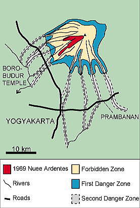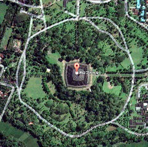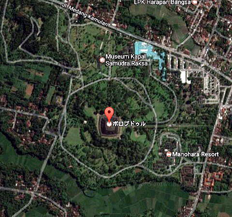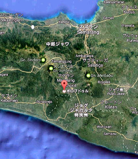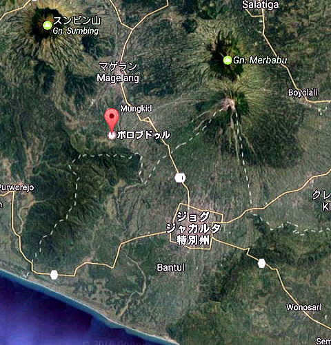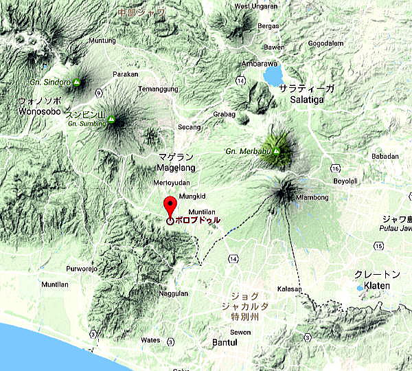 以下はボロブドウール寺院(遺跡)がある場所とその周辺の概要です。 ◆ボロブドゥールの全体-場所・概要 ボロブドゥール遺跡は、中部ジャワの中心都市ジョグジャカルタの北西約42km、首都ジャカルタからは東南東約400kmに所在し、巨大なムラピ火山などの山々に囲まれた平原の中央に立地、鎮座しています。 ![]() Source:Google Map ボロブドウール寺院はジョグジャカルタ市の北西の周りを山々で囲まれた盆地の中にあります。 ![]() Source:Google Map ◆ボロブドウール寺院周辺の地理・地形 以下は地形図で見たボロブドウール寺院の立地です。 ボロブドゥール遺跡は、中部ジャワの中心都市ジョグジャカルタの北西約42kmに所在し、巨大なムラピ火山(ムラビ火山は後述)に囲まれた平原の中央に立地しています。 以下の地形図ではムラビ山はボロブドールの北東にあります。 ![]() 地形図で見たボロブドウール寺院 出典:グーグルマップの地形表示 以下はムラビ山の立体図です。 ![]() 地形図で見たムラビ山(崋山) 出典:グーグルマップの地形表示 ボロブドウール寺院はまさに周りを山々で囲まれた盆地の中にあることが分かります。なお、ジャワ島には5つ以上の活火山がありますがとりわけ以下のムラビ山は、ボロブドウール寺院を取り囲む中部ジャワにあります。 なお、2010年ムラピ山の灰でボロブドウール寺院は大噴火の被害を受けています。 ![]() 出典:Wikipedia 以下は、日本の国土地理院の測定によるムラビ山の等高線とハザードマップです。