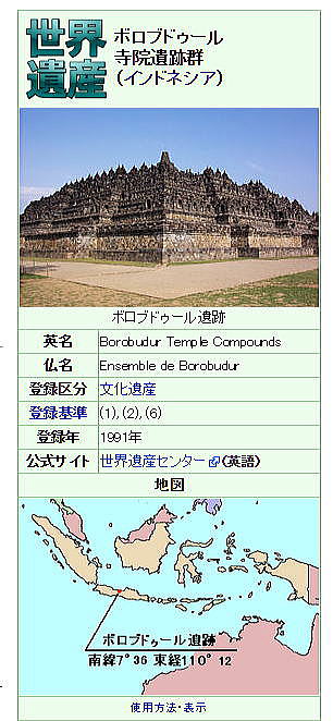 レリーフは、その構図の巧みさ、洗練された浮き彫り彫刻の技法、細部表現の優雅さで知られ、仏像とともにインドのグプタ様式の影響が強く認められるとされています。 ボロブドゥールはまた、その形状から世界最大級のストゥーパ(仏塔)でもあります。 ![]() 円形壇の上に築かれた釣鐘状のストゥーパ ストゥーパとは、釈迦の遺骨や遺物などをおさめた建造物ですが、ボロブドゥールは、さらにその内部にも多数のストゥーパを有する特異な構造を呈しています。 ストゥーパの釣鐘状になっている部分は、一辺23cm大の石のブロックを交互に積み上げ、中の仏像を拝することができるようになっています。漆喰などの接着剤の類を一切用いることなく積まれています。 ストゥーパ72基は、全体では三重円を描くように並び、頂上には釈迦の遺骨を納めたとされるひときわ大きなストゥーパがあり、天上をめざしています。この中心塔には大日如来を置かず空っぽにしており、大乗仏教の真髄である「空」の思想を強調しているとされ、ジャワ仏教の独自性が示されます。 ![]() ジョグジャカルタの北西にあるボロブドゥール寺院遺跡群 出典:Wikipedia ボロブドゥールは、それ自体が仏教的宇宙観とくに密教的宇宙観を象徴する巨大な曼荼羅といわれ、一説には、須弥山を模したものとも考えられています。ボロブドゥールは、その規模と構造の特異性より、ミャンマーのバカン、アンコール・ワットと並び、東南アジアの代表的な仏教遺跡とされています。 ![]() 1873年のボロブドゥール 2006年5月27日に起こったジャワ島の大地震で寺院の石塔の一部が崩れるなどの被害を受け、学者群が調査のあと、修復を予定しています。 ◆ボロブドゥール寺院遺跡群の世界遺産登録 ボロブドゥール遺跡(Borobudur)は、インドネシアのジャワ島中部のケドゥ盆地に所在する大規模な仏教遺跡で世界的な石造遺跡。世界最大級の仏教寺院であり、「ボロブドゥール寺院遺跡群」の一部としてユネスコの世界遺産に登録されています。