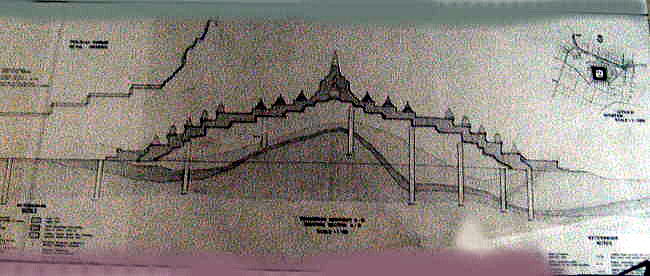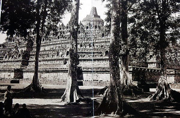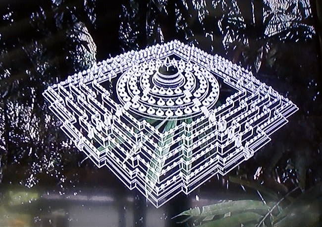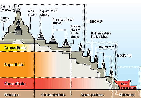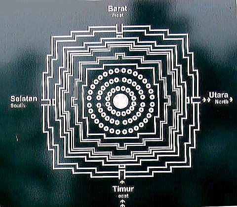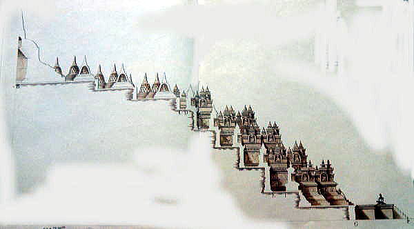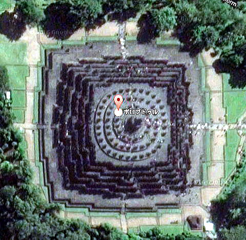 ◆ボロブドゥール寺院の外観・構造・建築 外観 ボロブドゥールは、平原の中央にある半径約50mの自然の地形の上に盛土し、安山岩や粘板岩を積み上げてつくられています。寺院として人びとに信仰されてきた建造物ですが、内部空間を持たないのが際だった特徴です。 遺跡の総面積はおよそ1.5万m2あり、高さはもともと42mありましたが、破損して現在は33.5mになっています。 下はグーグルアースで見た現在のボロブドゥール寺院です。 ![]() Source:Google Earth 以下は現地の案内板にあったボロブドゥール寺院の門の方位です。下の図では方位は下は東門でホテルに最も近い門です。時計回りで次が南門、写真中上が西門です。さらに右が北門となっています。多くの参拝者、観光客は東門からボロブドゥール寺院に入り、登ります。 ![]() 現地の案内板にあったボロブドゥール寺院の方位 撮影:青山貞一 Nikon Colpix S9900 2016-11-17 構造 ボロブドゥール寺院の構造としては、いちばん下に一辺が約115mの屈折した方形の基壇があります。そして、その上に基壇と相似形をなし、やはり屈折した5層の方形壇があります。そしてさらにその上にたくさんのストゥーパ(仏塔)を置く3層の円形壇があります。 ![]() ボロブドゥール寺院の断面図 出典:Wikipedia ボロブドゥール寺院はこのように全体として9層の階段型ピラミッド状の構造となっています。この構造は、仏教における三界をあらわしていると考えられています。なお、それぞれの高さの比は 2 :3 を基調とし、全体で 4 :6 :9 の比によって構成されています。 下図は、このボロブドゥール寺院の構造を断面(Cross Section)で表現したものです。 ![]() ボロブドゥール寺院の断面図 Source:A Divine Inspiration ボロブドゥール寺院の断面図撮影:青山貞一 Nikon Coolpix S9900 2016-11-18 下はボロブドゥール寺院のラフスケッチの断面図です。この図では、土台となる半径約50mの天然の丘に盛土してつくられていることが分かります。この断面図は翌日行ったボロブドゥール博物館に展示されていたものです。 ![]() ボロブドゥール寺院の断面図 出典:ボロブドゥール博物館 撮影:青山貞一 Nikon Coolpix S9900 2016-11-18 なお、ボロブドゥール寺院では外層、内層ともに四方(東ー西ー南ー北)に階段をもち、各面いずれも全く同形、同構造です。どれを正面とするかわからない、幾何学的に均斉な構造となっています。とはいえ、実際には東が正面となっています。 仏像は、第1回廊から第4回廊の壁龕(くぼみ)に432体、3段の円形壇の上に築かれた釣鐘状のストゥーパ72基の内部に1体ずつ納められており、いずれもひとつの石造りによって等身大につくられ、計504体を数えます。 下はマノハラ・ホテルのフロントの左隣にあった3次元CG(コンピュータグラフフィックス)によるボロブドゥール寺院の立体図です。門は四方(東ー西ー南ー北)と4方位にありますが、見てお分かりのように完全なシンメトリーの構造、配置となっています。 ![]() ホテルにあった3次元CGによるボロブドゥール寺院 撮影:青山貞一 Nikon Colpix S9900 2016-11-19 以下は「Prayer in Ston」という著作からです。 ![]() Source: Prayer in Ston 撮影:青山貞一 Nikon Colpix S9900 2016-11-19 ![]() Source: Prayer in Ston 撮影:青山貞一 Nikon Colpix S9900 2016-11-19 資材 ボロブドウール寺院の建築資材は、厚さ20cmから30cmの切石(煉瓦様ブロック)です。 ブロックは質の粗い黒灰色の安山岩や凝灰岩を切断して製造されており、寺院はこのブロックを積み上げて建造されています。使用されたブロックの個数は<200万弱>に及び容積は5万5,000m3、総重量は約350万tにもなるといわれています。 下の石は、まさにその切石(煉瓦様ブロック)です。 ![]() 撮影:青山貞一 Nikon Coolpix S9900 2016-11-17 これらの数字を見ただけでも、ボロブドウール寺院がいかに巨大であるかが分かります。 つづく |
