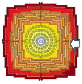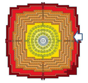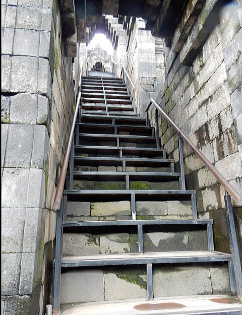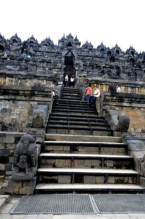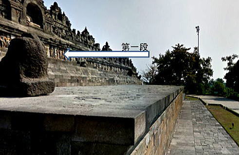 次に基壇ごとのレリーフを紹介します。その際、以下の凡例に即して紹介します。 <凡例> 今後のボロブドゥール寺院におけるレリーフの表示については、以下を基本とします。 (1)門 :ボロブドゥール寺院には東門、南門、西門、北門 と44つの門があります。 本稿では、大部分が「四門出遊」の最初となる東門で撮影しています。 「四門出遊」については、後述する「仏陀の生涯」の解説をご覧ください。 (2)壇数 :壇は下図にあるように、ボロブドウール寺院の地表に近い★1、から順次 ★2、★3、★4,★5 と下から上に向って5壇あり、その順序で紹介します。 ![]() n遺跡断面概念図と各壇数(1,2,3,4,5) (3) 列 :列は下図にあるように、門に近い回廊を1列目、2列目、3列目とします。 ![]() (4)レリーフ :レリーフ一:門に近い方から次第に離れる方向に紹介していますが、 枚数が膨大なので、紹介はごく一部となります。 なお、回廊から見られるレリーフに上段、下段がある場合の上段と 下段の意味です。 以下の写真は、回廊の上段、下段それぞれにレリーフがある場合です。 ![]() 出典:Wikipedia 以下の模型図は、上記の凡例を立体的に理解していただく助けになるはずです。 ![]() 撮影:青山貞一 Nikon Coolpix S9900 2016-11-18 なお、本頁の写真の出典は青山貞一、池田こみち Nikon Coolpix 9900 及びグーグルマップ・ストリートビューです。 以下は基壇を上る階段です。 ![]() 東門から上段に上る階段 撮影:青山貞一 Nikon Coolpix S9900 2016-11-17 ここでは、方形壇回廊のレリーフについては、下から第1壇、第2壇、第3壇、第4壇、第5壇として、各壇の「露天の回廊」にあるレリーフの一部を紹介します。 ◆東門 第1壇のレリーフ ![]() では、ここで実際にボロブドゥールのレリーフを順次見てみましょう! 最初の東門の第1壇です。 最初は一番下、第1壇のレリーフです。 一番下は下の写真にあるように、基礎石の上にある段を意味します。これより下には下の写真から明らかなように、レリーフはありません。 なお、ここではいずれも東門(East Gate)を対象とします。 ![]() 撮影:青山貞一 Nikon Coolpix S9900 2016-11-17 ![]() 撮影:青山貞一 Nikon Coolpix S9900 2016-11-17 ![]() 東門の最下段から最上段までの階段 撮影:青山貞一 Nikon Coolpix S9900 2016-11-17 |