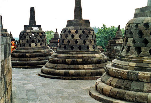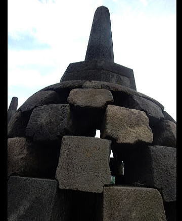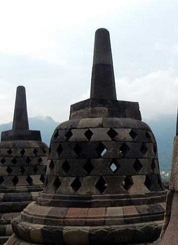 ボロブドゥール寺院のレリーフがある5層の方形壇回廊の上には3層の円形の基壇があります。この基壇の上には多数のストゥーパ(仏塔)があります。 以下はすでに紹介した内容ですが、ここに再掲掲載します。 ◆ボロブドゥールのストゥーパ(仏塔) ボロブドゥールはまた、その形状から世界最大級のストゥーパ(仏塔)でもあります。円形壇の上に築かれた釣鐘状のストゥーパ ストゥーパとは、釈迦の遺骨や遺物などをおさめた建造物ですが、ボロブドゥールは、さらにその内部にも多数のストゥーパを有する特異な構造を呈しています。 ストゥーパ72基は、全体では三重円を描くように並び、頂上には釈迦の遺骨を納めたとされるひときわ大きなストゥーパがあり、天上をめざしています。この中心塔には大日如来を置かず空っぽにしており、大乗仏教の真髄である「空」の思想を強調しているとされ、ジャワ仏教の独自性が示されます。 総延長5kmにおよぶ方形壇の回廊には、仏教説話にもとづいた1460面におよぶレリーフが時計回りにつづいています。 仏像は、回廊の壁龕(くぼみ)に<432体>、3段の円形壇の上に築かれた釣鐘状のストゥーパ<72基>の内部に1体ずつ納められており、合計では<504体>あります。 レリーフは、その構図の巧みさ、洗練された浮き彫り彫刻の技法、細部表現の優雅さで知られ、仏像とともにインドのグプタ様式の影響が強く認められるとされています。 ボロブドゥールはまた、その形状から世界最大級のストゥーパ(仏塔)でもあります。 ![]() 円形壇の上に築かれた釣鐘状のストゥーパ 下はボロブドゥール寺院の断面図です。ここにはすでに紹介したレリーフがある5層の方形壇の上に3層の円形壇があります。この円形壇の上にストゥーパ(仏塔)が置かれています。 ![]() ボロブドゥール寺院の断面図 レリーフがある5層の方形壇の上に3層の円形壇があります。 下の写真を見ると、3層の円形壇の上にストゥーパがあること、また中央に世界最大級のストゥーパ(仏塔)があることがよくわかります。 ![]() 出典:An Archi-Tecture of The Universe (ホテルにあった著作です) 以下はボロブドゥール寺院の全体断面図です。どの方位から見ても、同じ断面となります。 ![]() ボロブドゥール寺院の全体断面図e (ホテルにあった著作です) 出典:An Archi-Tecture of The Universe ストゥーパとは、釈迦の遺骨や遺物などをおさめた建造物です。日本語では仏塔と言います。 ボロブドゥール寺院では、さらにその内部にも多数のストゥーパを有する特異な構造を呈しています。 ストゥーパの釣鐘状になっている部分は、一辺23cm大の石のブロックを交互に積み上げ、中の仏像を拝することができるようになっています。漆喰などの接着剤の類を一切用いることなく積まれています。 ![]() ボロブドゥール寺院のストゥーパ 出典:Wikipedia 以下は、ストゥーパの拡大図です。サイコロのような立方体の石を積んだだけの非常にシンプルな構造となっていることが分かります。 ![]() 撮影:青山貞一 Nikon Coolpix S9900 2016-11-17 下は立方体ではなく、X字型のブロックを積み上げて作られていることが分かります。 ちなみにこのストゥーパに格子状の小窓がありますが、正方形と菱形があるのがわかります。正方形は安定した賢者の心、菱形は不安定な俗界の人の心を表しているとのことです。そして頂上の大ストゥーパには窓がなく、これは迷いのない「無」の状態を表しています。 参考:JTB ![]() 撮影:青山貞一 Nikon Coolpix S9900 2016-11-17 ボロブドゥール寺院の722基のストゥーパは、全体では三重円を描くように並び、頂上には釈迦の遺骨を納めたとされるひときわ大きなストゥーパがあり、天上をめざしています。 このストゥーパの中心塔には大日如来を置かずに空っぽにしており、大乗仏教の真髄である「空」の思想を強調しているとされ、ジャワ仏教の独自性が示されます。 また、その形状から世界最大級のストゥーパ(仏塔)でもあります。ストゥーパとは、釈迦の遺骨や遺物などをおさめた建造物ですが、ボロブドゥール寺院は、さらにその内部にも多数のストゥーパを有する特異な構造を呈している。 下はボロブドゥール寺院のストゥーパ(仏塔)です。中央にそびえるストゥーパ(仏塔)が中央塔です。 ![]() ボロブドゥール寺院のストゥーパ 出典:Wikipedia 以下はボロブドゥール寺院のストゥーパ(仏塔)の拡大図です。実際には、このストゥーパ(仏塔)は、石を積み上げて作られています。 ![]() ボロブドゥール寺院のストゥーパの拡大 なお、宿泊先ホテルの庭には、そこかしこに以下のストゥーパのレプリカが置かれていました。 ![]() 撮影:青山貞一 Nikon Coolpix S9900 2016-11-17 つづく |