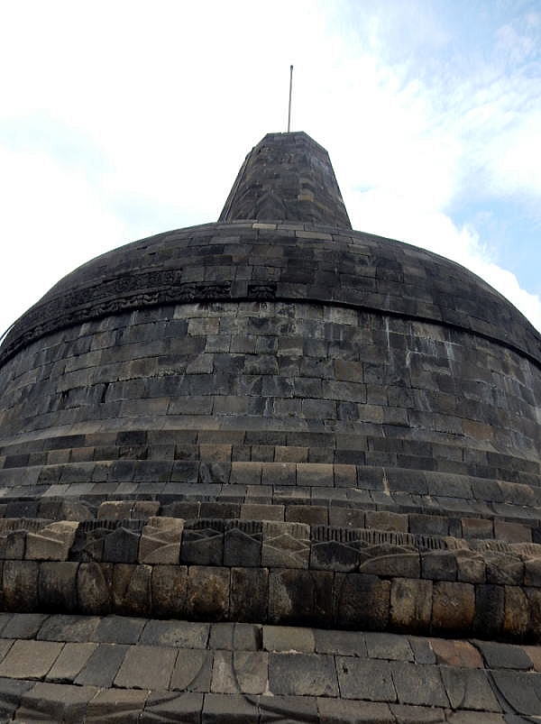 以下は現地で撮影したボロブドゥール寺院の<ストゥーパ(仏塔)>です。 ![]() 撮影:青山貞一 Nikon Coolpix S9900 2016-11-17 ![]() 撮影:青山貞一 Nikon Coolpix S9900 2016-11-17 ![]() 撮影:青山貞一 Nikon Coolpix S9900 2016-11-17 ![]() 撮影:青山貞一 Nikon Coolpix S9900 2016-11-17 以下の二枚の写真を見ると、<ストゥーパ>が石を積み上げてつくられていることがよくわかります。 ![]() 撮影:青山貞一 Nikon Coolpix S9900 2016-11-17 石と石のつなぎ目には、一切漆喰、セメントなどを使っておらず、あくまでも石の重みだけで釣鐘状のストゥーパができています。したがって、もし大地震が起きると、石組が崩れ落ちる可能性があります。 ![]() 撮影:青山貞一 Nikon Coolpix S9900 2016-11-17 頂上には釈迦の遺骨を納めたとされる、ひときわ大きなストゥーパがあり、三界の最上位として天上をめざしています。この大中心塔には大日如来を置かず「空」にしており、大乗仏教の真髄である「空」の思想を強調しているとされ、ジャワ仏教の独自性が示されます。 以下の写真は中央にそびえる大中心塔(大ストゥーパ)です。このストゥーパも、石を積み上げて作られていることがよくわかります。 ![]() 撮影:青山貞一 Nikon Coolpix S9900 2016-11-17 ![]() 撮影:青山貞一 Nikon Coolpix S9900 2016-11-17 以下の写真の中央の頂上にあるのが大中心塔(大ストゥーパ)です。 ![]() ボロブドゥール寺院の全体断面図e (ホテルにあった著作です) 出典:An Archi-Tecture of The Universe つづく |