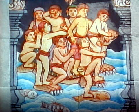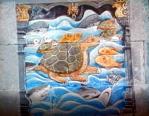 ◆海亀に化身した仏陀 商人たちの乗った船が遭難しました。 ![]() 註)以下はボロブドゥール寺院の基壇回廊にある実際のレリーフです。 ![]() 仏陀は巨大なウミガメとなって商人等を救います。 ![]() やがて彼らが飢えていることを知ると、仏陀は自らの身体を食物として与えるのでした。 ![]() ![]() 註)以下はボロブドゥール寺院の基壇回廊にある実際のレリーフです。 ![]() 以上、仏陀のそれぞれの動物への化身による逸話が、私たちに何を教えているのかについては、各自考えていただければと存じます。 ◆善財童子のレルーフ このように第一壇の回廊を4周して、仏陀の足跡を辿った後、巡礼者はさらに上層の回廊へと進みます。 第2層から第4層までの回廊を2周ずつ、合計6周が残されています。 この上層の回廊を6周しながら巡礼者が出会うレリーフに刻まれているのは、善財童子(ぜんざいどうじ)と呼ばれる若い上人が悟りを開くまでの物語です。