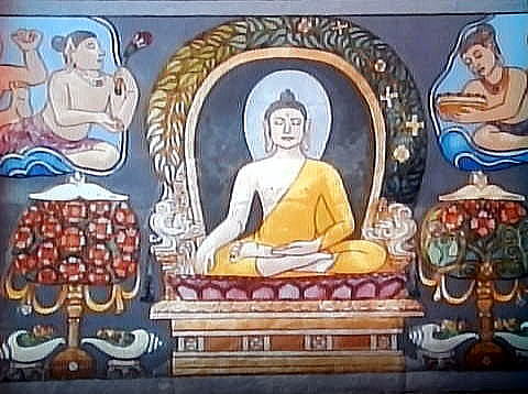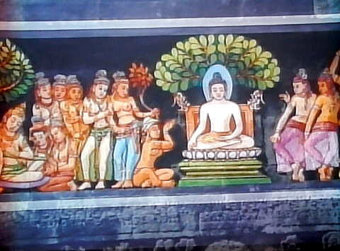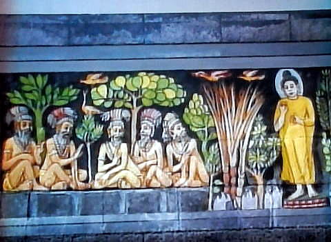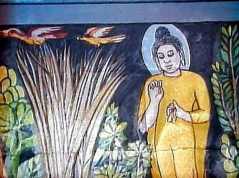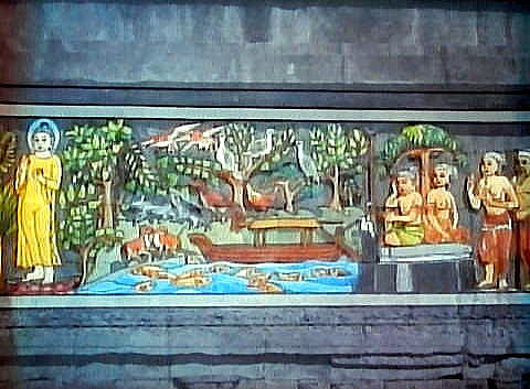 【成道と説法】 マラはまた三人の美女となって誘惑を試みますが、これも失敗に終わります。 ![]() 撮影:青山貞一 Nikon Coolpix S9900 2016-11-18 以下同 ![]() その他、あらゆる誘惑に打ち勝った仏陀は菩提樹の下で、ついに一切の煩悩を超越し、悟りを得たのでした。 ![]() ![]() 悟りを開いたのち、仏陀はガンジス川に至りますが、船頭は渡し賃を持たない仏陀を拒みます。 ![]() しかし、驚く船頭をあとに、仏陀は川の上を飛び越えて渡っていくのでした。仏陀にとってはもはや金銭も無用のものとなりました。 ![]() 驚く船頭を後に仏陀は川を飛び越えてゆくのでした。仏陀にとって、金銭ももやは無用のものとなりました。 ![]() やがて仏陀は、かつて仏陀が断食を破ったことで彼を見限った5人の弟子に再会し、最初の説法を行います。 ![]() この説法によって五人の弟子達は次々に悟りを得、以後多くの人々が仏陀の説法によって悟りを得ることになりました。 ![]() 仏陀の生涯をあらわす仏年図は、この最初の説法が行われた転法輪という名で知られる場面で終わりとなります。 転法輪は、仏陀が教えを説くこと。説法を意味します。法輪は仏の教えを転輪王の武器である輪宝になぞらえたもので、転は説くことを意味します。 ![]()