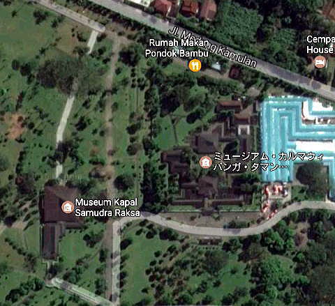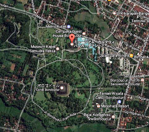 宿泊先ホテルの視聴覚ルームでボロブドゥール寺院のDVDを視聴した後、私達はお昼に昨日、ボロブドゥール遺跡遺跡の参拝、視察の帰りに通ったボロブドゥール博物館に向かいました。 この博物館は、正規には Musium Karmawibangga Taman Wisata Candi Borobudur、ミュージアム・カルマウィバンガ・タマン・ウィサタ・キャンディ・ボロブドゥールと言います。 すごく長い名称ですので、ここでは、単にボロブドゥール博物館と略称します。 下のグーグルマップにあるように、この博物館はボロブドゥール寺院遺跡のほぼ北側にあります。中央左にボロブドゥール遺跡遺跡が、その北側(上側)に博物館があります。 距離にして寺院からは約350mですが、ホテルからは600mほどとなります。 ボロブドゥール博物館は、このように東参道から90度ずれた北側にあるので、多くの参拝者、とりわけ観光客は、立ち寄ることがないようです。 ![]() 出典:グーグルマップ 宿泊先のホテルからボロブドゥール博物館へはボロブドゥール寺院の外周道路を横切ってゆくことになります。 この時点では写真にあるように、晴天でしたが、博物館入館時には落雷を伴う激しいスコールが降り出しました。その後、スコールは止みましたが、まさに急に激しい雨が降り、一定時間でぱたーと止むのが東南アジアのスコールの特徴です。 以下は外周道路が東参道と交差する地点です。 外周道路からボロブドゥール寺院がよく見えます。 ![]() 撮影:青山貞一 Nikon Coolpix S9900 2016-11-18 以下のグーグルマップのほぼ中央がボロブドゥール博物館、左下がサムドラ・ラク船博物館です。 ![]() 出典:グーグルマップ 以下は、昨日、外周道路と参道との交差点で撮影した写真です。 ![]() 撮影:Nikon Coolpix S9900 2016-11-18 実は上記の写真を撮影してくれたのは土産物売りの男性でした。 ボロブドゥール寺院周辺は、法律によって、土産物、写真などの撮影、販売が厳しく禁止されていますが、その制限区域を出ると、一気にものすごく激しい、物売りが近づいてきて、いくらいらないと言っても、あれこれ言いながらついてきます。 とくに昨日は、私たち以外外国人がこのあたりにいなかったこともあり、標的となったようです。 英語を話す物売りが多いのですが、片言の日本語を話すものうりもいます。 昨日は、実に恣意100mもついてきました。流石に持てるの区域に貼るととあきらめたようですが、そのすごさは半端ではありません。 こちらもインドネシアまで来て、言い争いをしているわけにはゆきません。とりわけしつこいのは、観光写真売りです。今回、敢えて現地に来ているのは、自分たちならではの写真を撮影したいからなのですが、それを言っても始まりません。 当初の値をどんどん下げ、最後は1/3程度にしていました(笑)。 ところで、これから行くボロブドゥール博物館がある地域は、制限区域外であり、うまく切り抜けないと、たいへんなことになります。 そのようなこともあり、この日は激しい物売りがいる地域をうまく避けてボロブドゥール博物館がある地域までくることに成功しました(笑)。 この物売りは、翌日行く、パワン寺院、ムンドッ寺院でも同様に激しいものがありました。物売り側に生活が懸かっていることは十分わかりますが、かといって、そのものすごさには閉口します。 ところで、ボロブドゥール博物館近く目で進むと、以下の写真のようなフェンスに出会います。ボロブドゥール博物館はこの左に入り口があります。 ![]() 撮影:青山貞一 Nikon Coolpix S9900 2016-11-18 つづく |