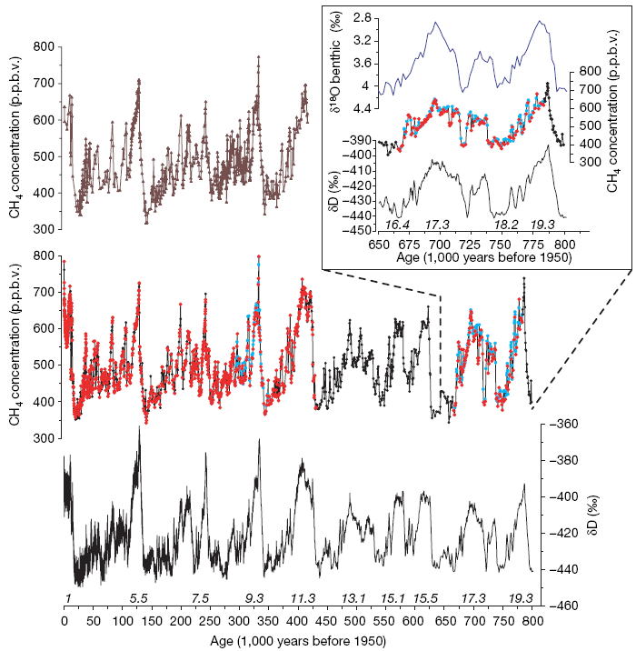 ドームCによる氷床分析の最も重要な結果の1つは、過去40万年間に渡り、ボストーク基地で以前に検出された重水素と”温室効果ガス”の含有量の変化の確認であった。80万年から40万年前の時間をカバーする以前の期間では、地球軌道のパラメーターの変化に関連し約10万年のサイクルも追跡された。この間ずっと利用可能な海底堆積物の同位体組成に関するデータは、陸上の氷河の開始と後退の正しい交互を確認した。 最新のジャーナル「Nature」に掲載された論文では、650〜80万年前の期間をカバーする200m未満の氷床コアの分析結果に主な注意が払われている。当時のCO2含有量はその後のすべての時代よりも低く、わずか180-210 ppm(百万分の1-百万分の1)であり、現在の380ppmのレベルはそのほぼ2倍である。それにもかかわらず、変更の周期的な性質はほぼ同じである。 ![]() 上図中の上の曲線は温度変動である。下の曲線は、ボストーク基地のドームC(紫、青、黒、赤の点)からの氷床コア分析によると、80万年間の二酸化炭素(CO2)含有量をppmで示している。 緑色の点とテイラードームから(茶色の点):水平の破線は、特定の期間の平均温度またはCO2含有量を示す。タイムラインは数十万年前であり(kyr BP)。 さまざまな色を使用して、さまざまな場所または1つの場所で取得された他の記事で公開されたデータを示すが、方法は異なる。 参考 Lüthiet al。、2008 タイムラインは数十万年前である(kyr BP)。さまざまな色を使用して、さまざまな場所または1つの場所で取得された他の記事で公開されたデータを示すが、方法は異なる。 参考 Lüthiet al。、2008 ドームCからの気泡のガス組成を研究して、著者は異なる方法を使用した。特に、気候環境物理学ではレーザー吸収分光法(レーザー吸収分光法を参照)とグルノーブルのガスクロマトグラフィー研究所(ガス液体クロマトグラフィーを参照)を使用した。さまざまな方法で得られたデータは、値のばらつきが調査対象ガスの低濃度で大きかったものの、良好な一致を示した。 ![]() 掘削の深さ(m)とCO2濃度(ppmv) ドームC(東南極コンコルディア基地)の氷床コア内の気泡の分析による800〜60万年前の大気中のCO2含有量のダイナミックス(100万分の1、ppm-100万分の1)。 上図: 氷の深さのスケール-3040〜3190m 時間スケール(数千年前)。 異なる色は、いくつかの異なる方法を使用して異なる研究所で得られた値を示す。 MIS(Marine Isotope Stage)-地球の歴史の段階。海底の底質の同位体分析に基づいて強調されている。参考 Lüthiet al。、2008 二酸化炭素含有量の大規模な変動は、海洋と陸の関係のシステムの変化によって大部分が決定されたが、メタン濃度の変動は、土地、特に気温の急激な変化によって引き起こされるモンスーンで発生するプロセスにより大きく依存していた 。 メタン含有量の対象期間のほとんどの間、350から800のppb(範囲であった10億分の1 - ppb)が、メタンの濃度の現在のレベルが有意に高く、1770 ppb。メインメタンサイクルの頻度は約10万年だが、シリーズ全体のスペクトル分析では4万1万年と2万3万年の期間も明らかになっている。それらはすべて、地球の軌道のさまざまな特性に関連付けられている。 ![]() メタン濃度の時間変動(上図では1950年から80万年前を示す) 80万年にわたる大気中のメタンCH4の変化(10億分の1、ppb-10億分の1)。 1950年は、カウントダウンの始まり(スケールの左端)と見なされる。上の茶色の線は、ボストーク基地からの氷のコアによるものである。 中央の曲線(赤、黒、青の点)-ドームCの氷床コアデータ(黒の点-以前に公開されたデータ。赤-分析結果はグルノーブル、青-ベルン) 。下の黒い曲線は重水素含有量である(ピークは温度上昇に対応)。 右上の挿入図: -650〜80万年前の期間について詳細に調べたデータ。上の曲線は海洋堆積物の重水素含有量(海水温の指標)、中央の曲線は大気中のメタン含有量、下の曲線はドームCの氷の重水素含有量である。 非常に良い共役が見られる。 参考 Loulerlegue et al。、2008 達成された成功にもかかわらず、氷河学者は東南極で、さらに長い期間、最大150万年をカバーする氷のコアを取得できるポイントを探している。 出典: 1)DieterLüthi、Martine Le Floch、Bernhard Bereiter、Thomas Blunier、他 高解像度の二酸化炭素濃度は、現在の650,000〜800,000年前の記録 // Nature.V.453。P.379–382。 2)Laetitia Loulergue、Adrian Schilt、Renato Spahni、他 過去800,000年にわたる大気中のCH 4の軌道規模および千年規模の特徴 // Nature.2008. V. 453. P. 383–386。 3)エド・ブルック。古気候:温暖上のWindows // Nature.V.453。P.291–292。 参照: 1)アイシングには、800 , 000年間の粉塵が伴う、「エレメント(Elements)」、2008 年4月14日。 2)過去80万年間の南極の気候は、地球の軌道の変化、「エレメント(Elements)」、2007年8月17日。 3)南極の氷コアリングに関する欧州プロジェクト(EPICA)。 ◆青山貞一訳者コメント セルビアのメランコビッチが100年前に理論仮説を立てたことをメランコビッチ自身が放射性同位体を用いて海水温の調査