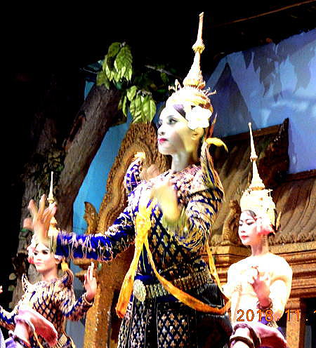 | アンコール遺跡全体目次 カンボジア民族舞踊とは 民族舞踊(静止画) 民族舞踊(動画) 今回、アンコール遺跡視察の合間(夕食時)に、カンボジアの伝統舞踊で有名な、アプサラを宿泊先ホテルの遺跡案内人(学芸員)の計らいで、最前列でじっくりみることができました。 カンボジア舞踊は民衆舞踊、民族舞踊、古典舞踊に分けられます。古典舞踊は神々に捧げるための宮廷舞踊で、女神(アプサラ)のダンスであるのに対し、民衆舞踊や民族舞踊は一般庶民のための舞踊で有り、生活や暮らしに根ざしています。 ◆民衆舞踊:カンボジア人なら誰もが踊れる楽しい踊り。 4月のカンボジア正月などに皆で踊ります。 ◆民俗舞踊:人々の暮らしや、農作業の中で生まれた踊り。 ココナツダンス、魚捕りの踊りなどが有名です。 今回の視察では、民族舞踊の魚取り踊りとココナツダンスと女神のアプサラダンスを組み合わせたショーを見ました。 一方、古典舞踊:神々にささげるために宮廷で伝えられてきた踊りでは、アンコール・ワットの壁画から作られたアプサラダンスなどが有名です。カンボジアの伝統舞踊、アプサラについて、カンボジアナビから以下にその概要、歴史などを紹介します ◆カンボジアの伝統舞踊・アプサラとは 出典:カンボジアナビ カンボジアの伝統舞踊といえばアプサラ・ダンスが有名です。アプサラは『天使・天女』を意味し、踊りは神への祈りとして捧げらるものでした。 9世紀頃に生まれたこの宮廷舞踊は、アンコール遺跡のレリーフにも数多く登場する踊りで今やカンボジアの名物になっています。 ![]() カンボジアの伝統舞踊、アプサラ シェリムアップのレストランシアターにて 撮影:青山貞一 Nikon Coolpix S9900 2018-4 ![]() カンボジアの伝統舞踊、アプサラ シェリムアップのレストランシアターにて 撮影:青山貞一 Nikon Coolpix S9900 2018-4 踊り子の反り返った手と指の動きが特徴的ですが、それぞれの手や指の動きには意味があり、生命の一生、儚さを花の芽生えから実が落ちるまで例えて表しています。 踊り子は王室古典舞踏学院にて養成されていましたが、ポル・ポト政権のクメールルージュによって、宮廷古典舞踊は王政を祭わるものとして、300人を超す先生や踊り子のうち90%もの人々が処刑の対象となってしまいました。 振り付けを記録した書物もこの時にほとんどが消失したそうです。難を逃れた数人の先生たちの働きによって復活を果たし、1989年から伝統舞踊の復活を目的に舞踏教室が始められました。 「似たような踊りをタイで見たからいいや」と言われる方も多いのですが、実は源流はカンボジアなのです。 アンコール王国が15世紀にシャム(タイ軍)に滅ぼされたときに宮廷舞踊団がそのまま連れて行かれ、アユタヤ朝の娯楽とされ、アユタヤ文化として栄えた後に、カンボジアに逆輸入されることとなりました。タイのアユタヤ舞踊との違いを感じるのも面白いかもしれません。 アプサラショーはアンコール遺跡があるシェムリアップだけでなく首都プノンペンでも見れるとのことです。