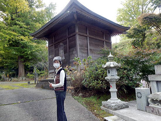 安久山日蓮宗の円静寺のお堂を背景にした池田こみち
