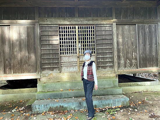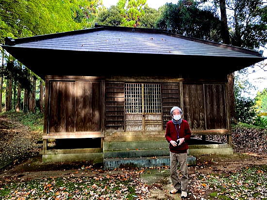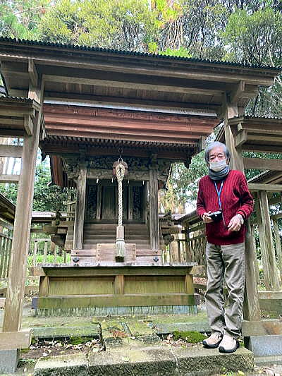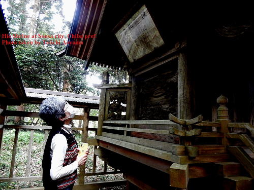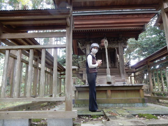 本殿には日露戦争時におそらくこの村から出征した2名の名前が入った額のようなものがある。そのなかに明治37年に出征との記述があった。日路戦争が明治38年からだから間違いない。以下の写真で池田が見ている額のようなものがそれである。